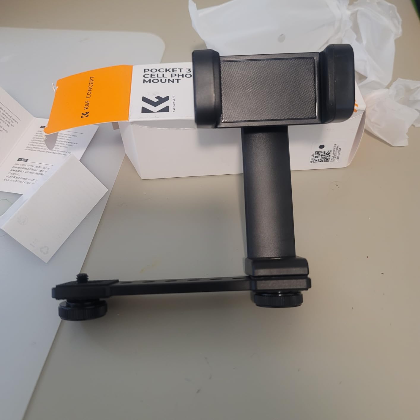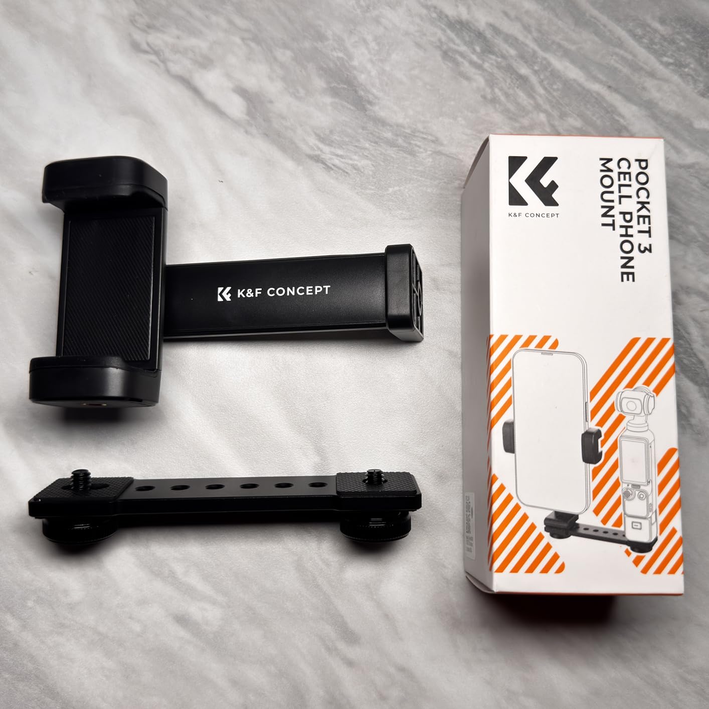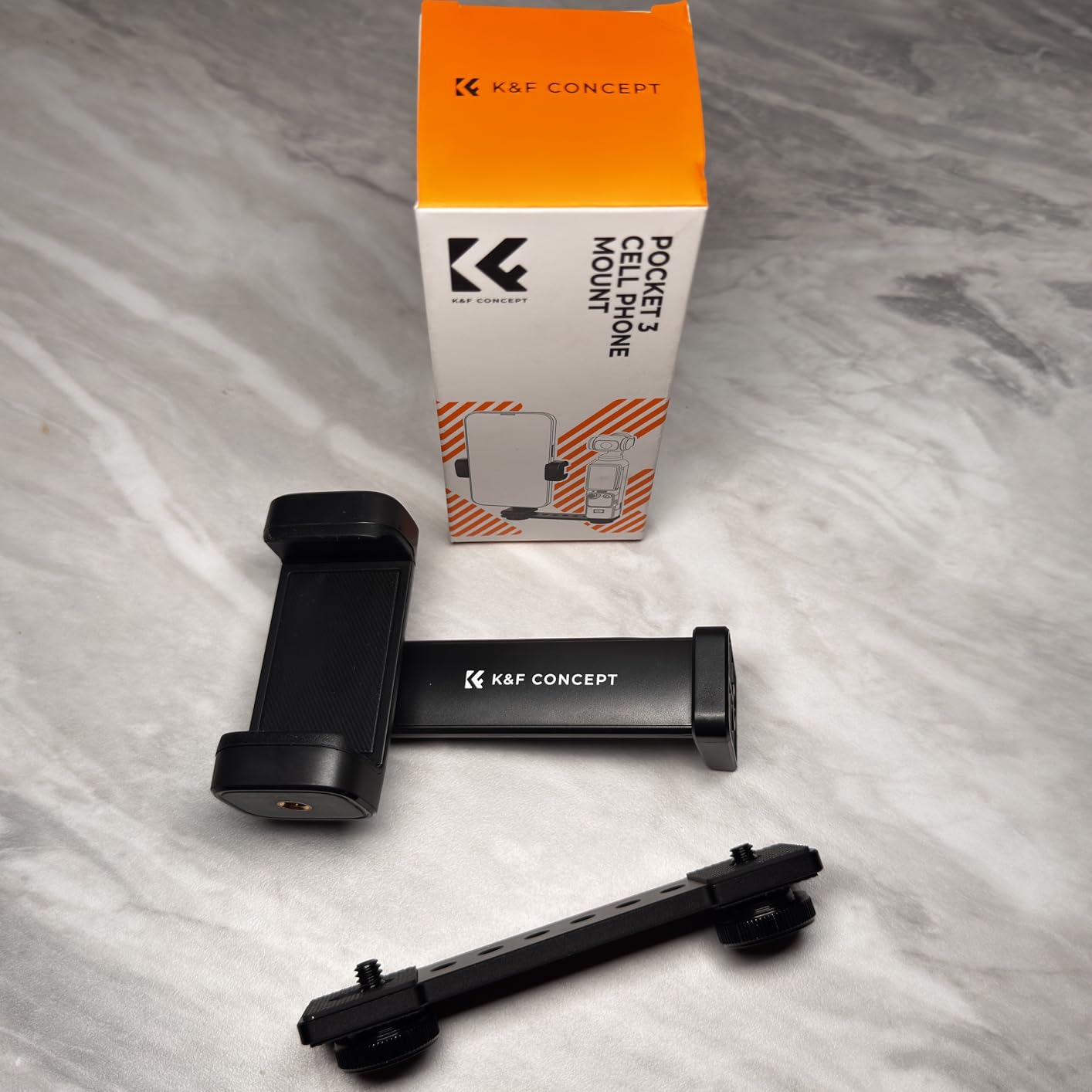 Review of the K&F Concepts Phone Mount for OSMO Pocket 3I recently had the opportunity to try out the K&F Concepts Phone Mount designed specifically for the OSMO Pocket 3.Design & Build Quality:The mount boasts a sleek, sturdy design crafted from high-quality materials. It feels solid and durable, with a well-finished surface that complements the OSMO Pocket 3's aesthetic. The adjustable grip holds the phone securely without causing any scratches, thanks to the soft padding.Ease of Use:Setting up this mount is really straightforward. The adjustable clamp mechanism allows for quick installation and removal of your phone. It fits snugly with different phone sizes, even larger phones like 16pro max, maintaining stability even during movement, which is crucial for dynamic shooting.Compatibility & Flexibility:The mount aligns perfectly with the OSMO Pocket 3, offering excellent balance and preventing strain on the gimbal. Its rotation and tilt capabilities are impressive, providing flexible angles for diverse shooting scenarios.Performance:In use, the mount significantly enhances the OSMO Pocket 3 experience. It adds stability while allowing seamless control through the phone's screen. The grip remains strong, even in outdoor, rugged conditions.Pros:Solid, durable constructionEasy to install and adjustExcellent stability and gripVersatile compatibility with different phone sizesCold shoe mount on side of the phone clip for LED fill lightsVery Smooth head movement that allows the phone to switch from portrait and landscape.Cons:NoneFinal Verdict:The K&F Concepts Phone Mount for the OSMO Pocket 3 is a reliable accessory that enhances shooting experiences with added stability and flexibility. Its superior build quality and performance make it a worthwhile investment for both amateur and professional videographers.