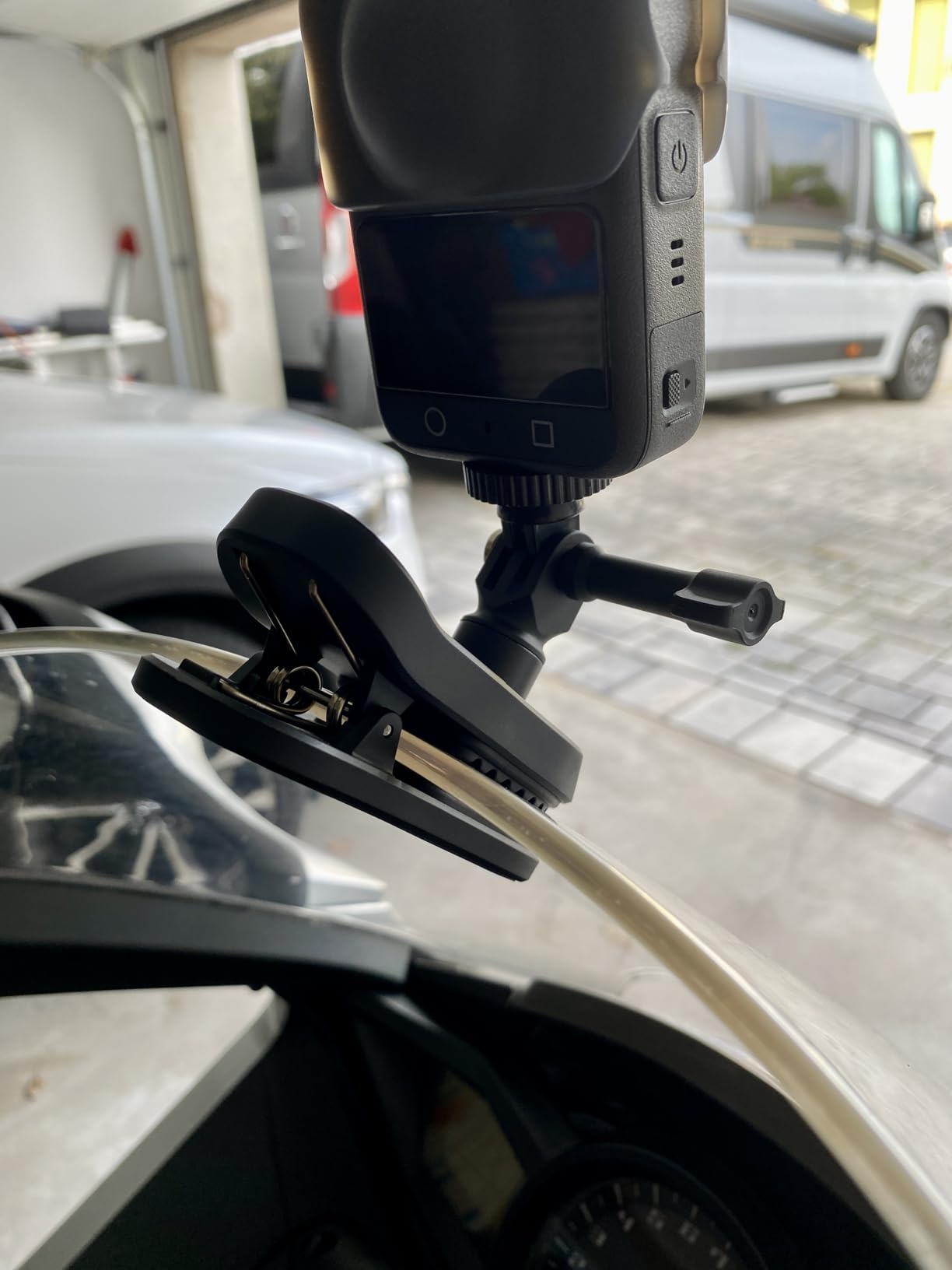 .. really firm. This clip is surprisingly suitable for attaching an action cam to the windshield of a motorcycle, for example. The material thickness that it can hold is decisive. It is designed more for thinner surfaces and distributes the pressure very evenly, which ensures a secure grip. With thicker surfaces — such as a 7 mm thick shower glass panel — it no longer closes completely and only lasts to a limited extent. A material thickness of around 3 to 4 mm appears to be optimal. The integrated magnetic function is a nice extra, but not intended for dynamic applications. The magnetic holding force is too weak to take pictures on a car or motorcycle while driving. It still works best on vertical surfaces, but barely across. The rubber coating on all contact surfaces, which reliably protects sensitive surfaces, is positive. Overall, the clamp is robust and versatile — but the magnetic mechanism is more of an addition than a real replacement for a firm clamp.