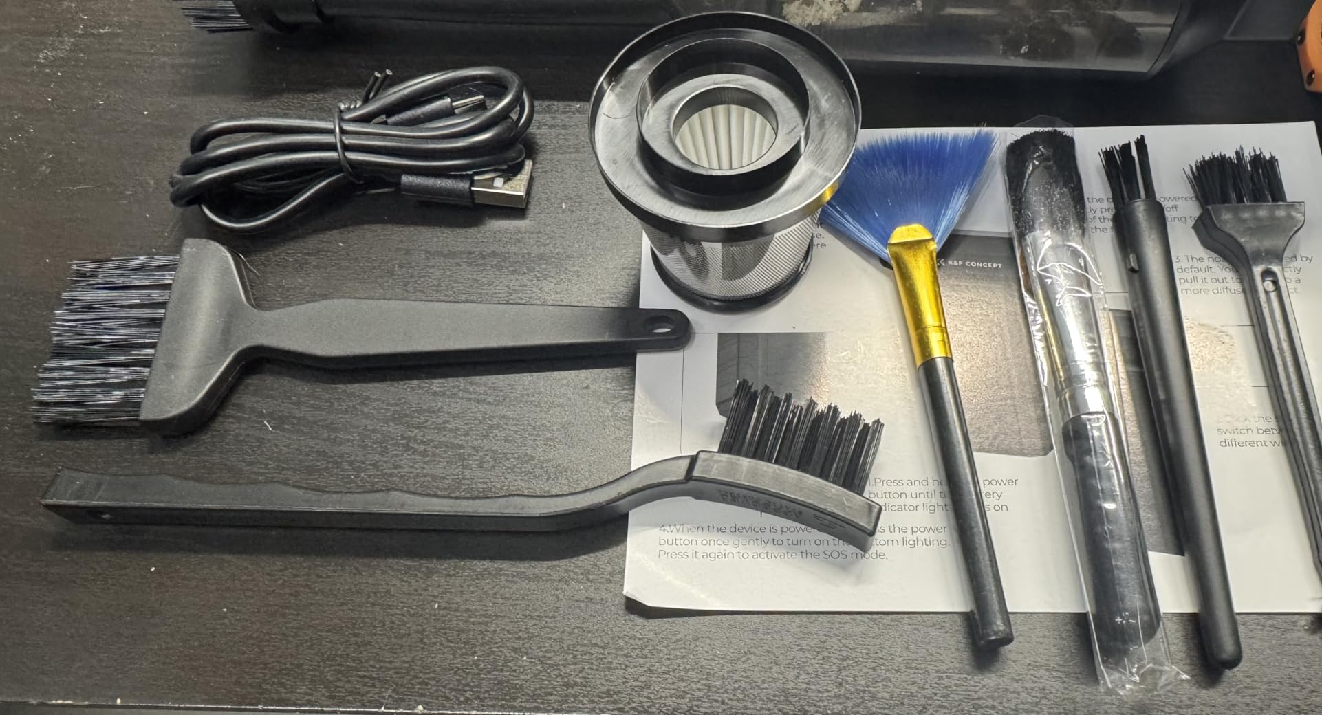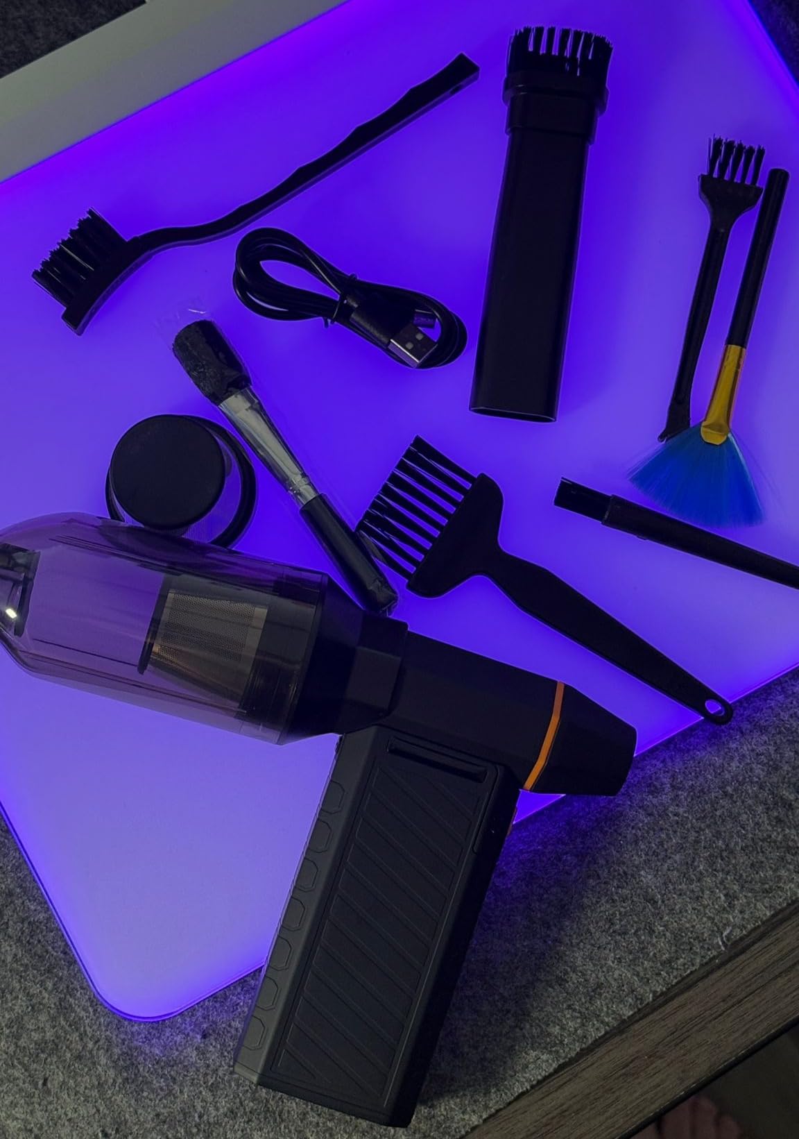 The blower comes with a variety of brushes and brushes for easier dust removal, as well as a USB-C charging cable. For the vacuum function, it includes a spare filter and a flat tube with a removable brush. Whether cleaning a keyboard, blowing out a PC fan, or removing dust trapped in hard-to-reach corners, it really gets the job done! I highly recommend this incredibly practical little gem. If I had to find a fault, I'd say it lacks a long, thin nozzle for the blower, which would be very useful in many situations. However, given the quality of the product and the other included accessories, this is easily forgiven.
