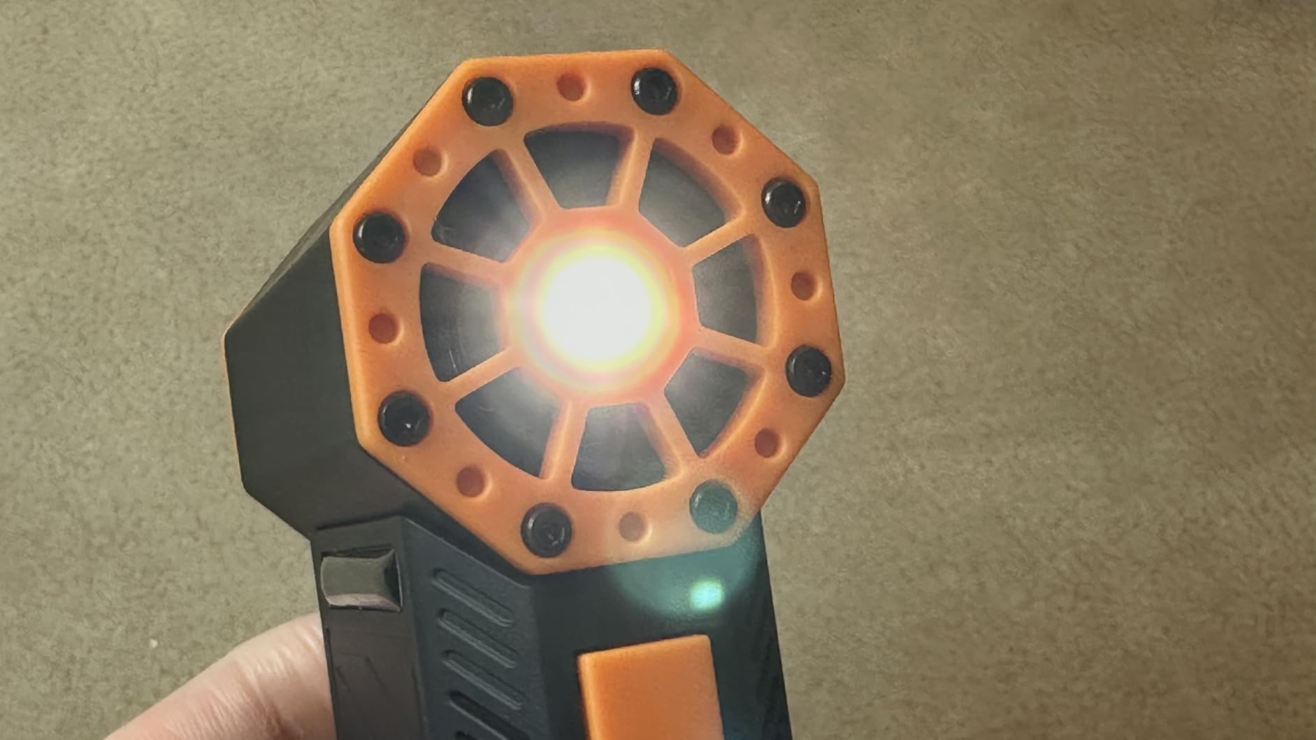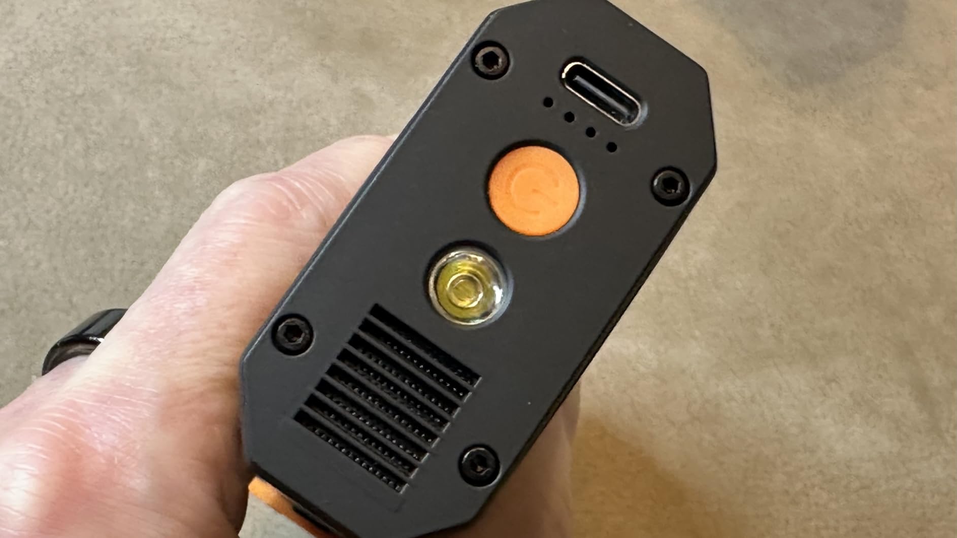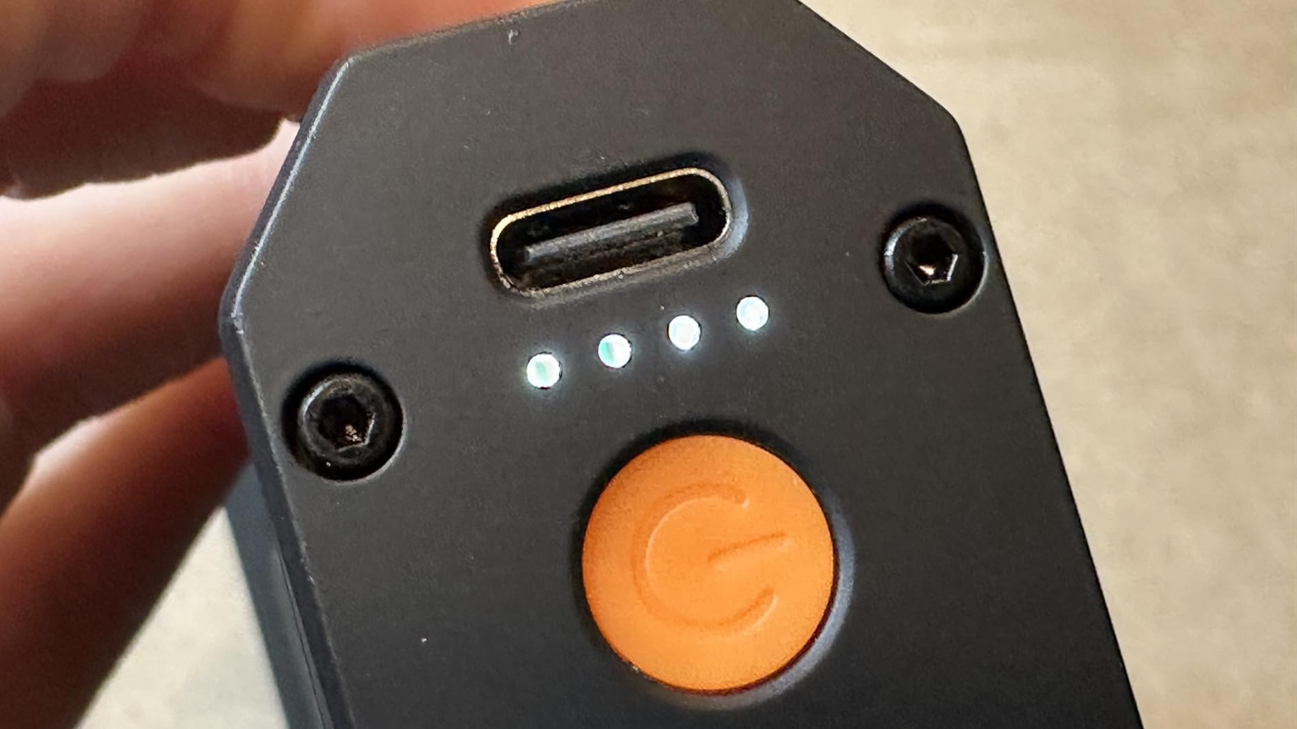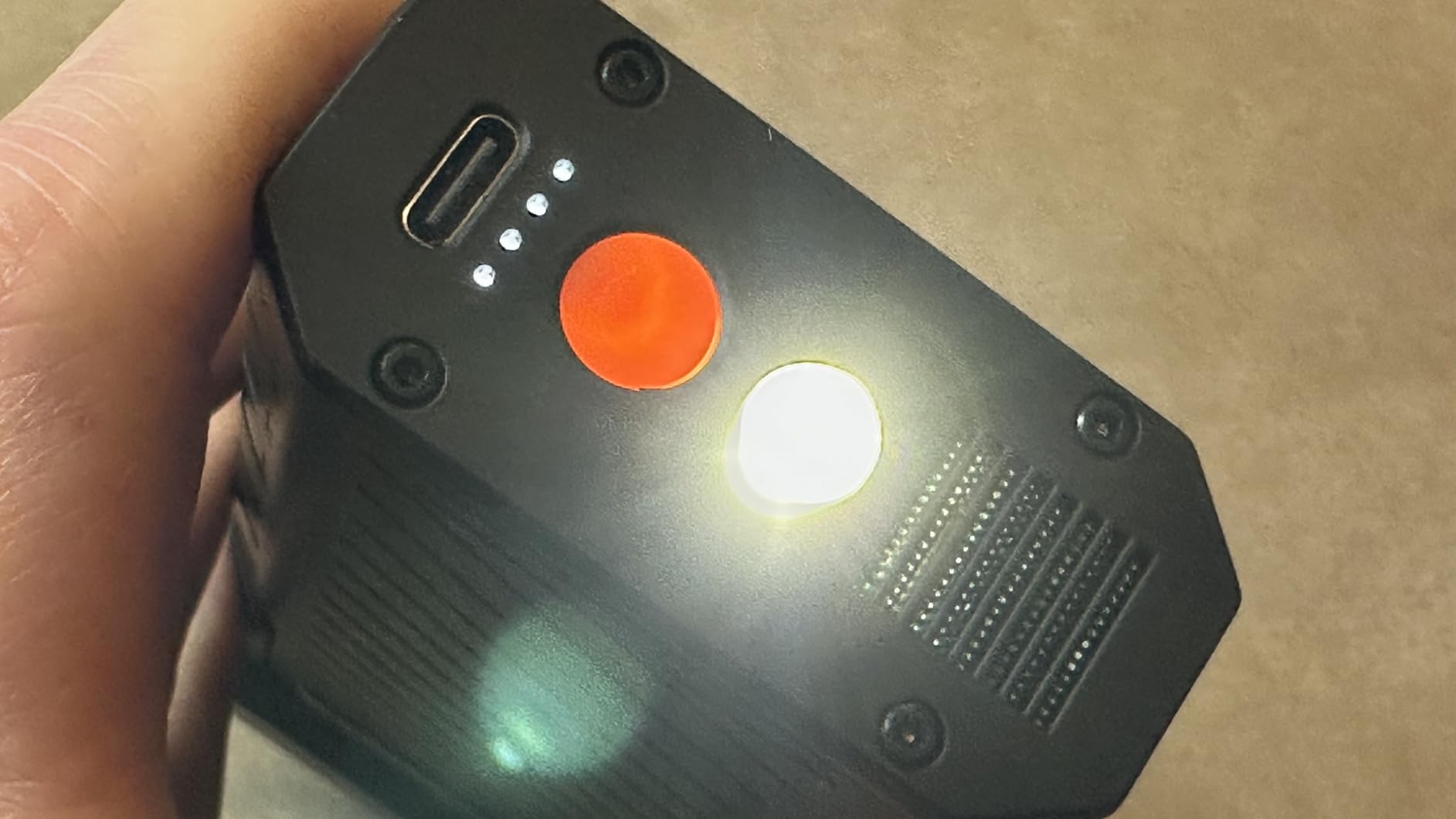 It's powered by a rechargeable battery, which can be charged via a USB-C port located on the bottom of the handle. Also on this part is a button that activates an LED flashlight. Pressing it again activates emergency flashes. Pressing this button also illuminates one to four LEDs to indicate the battery level, with each LED representing 1/4 of the battery.