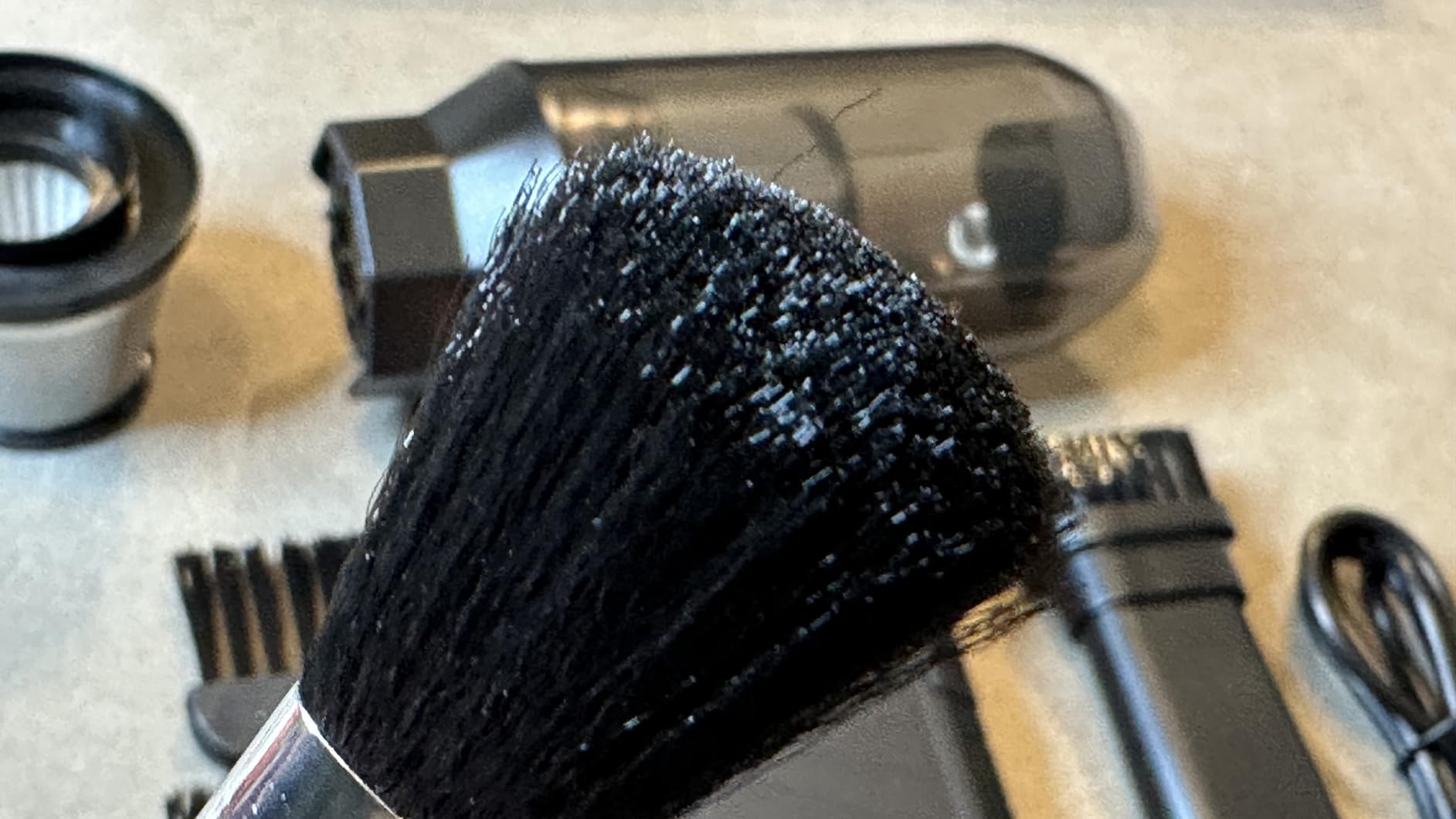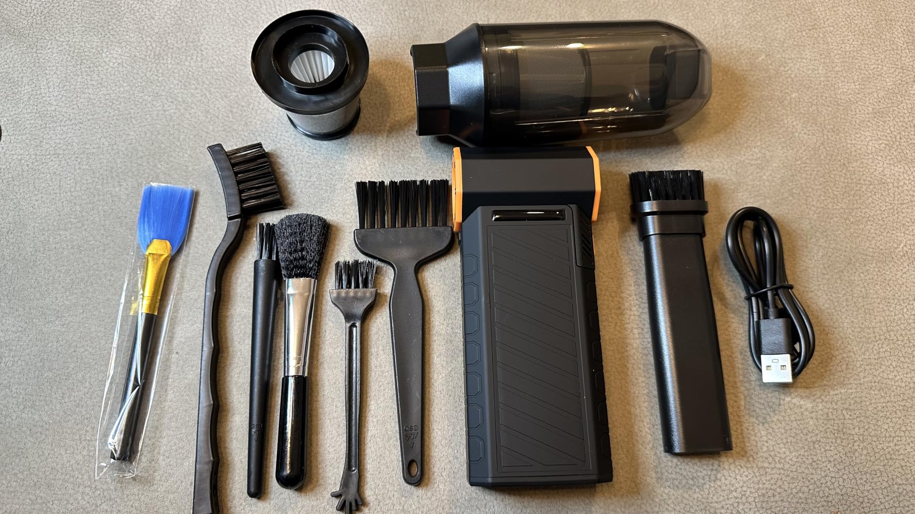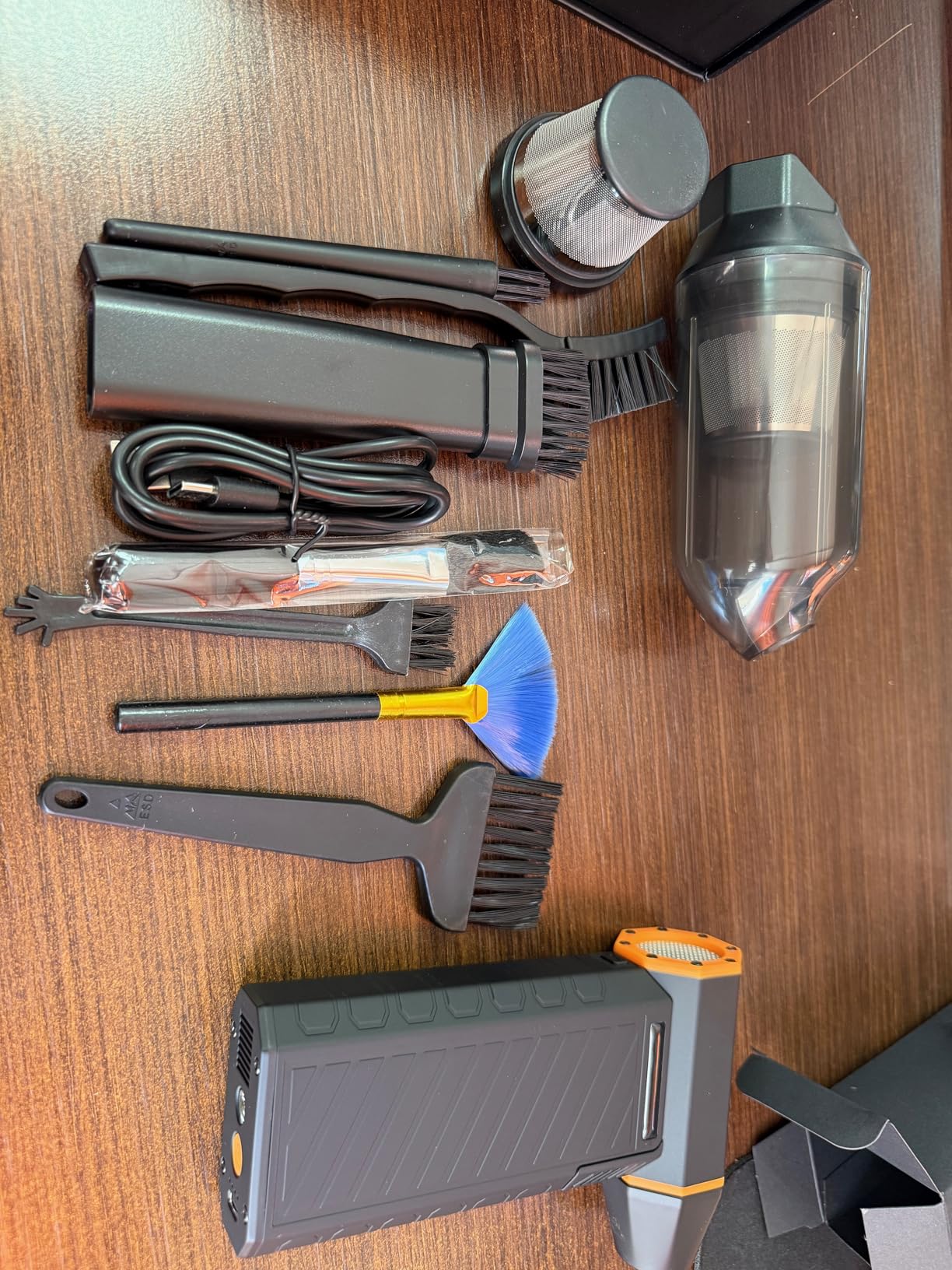 The air blower arrives in a nice, sealed box along with several cleaning brushes, a USB cable, and user manuals.