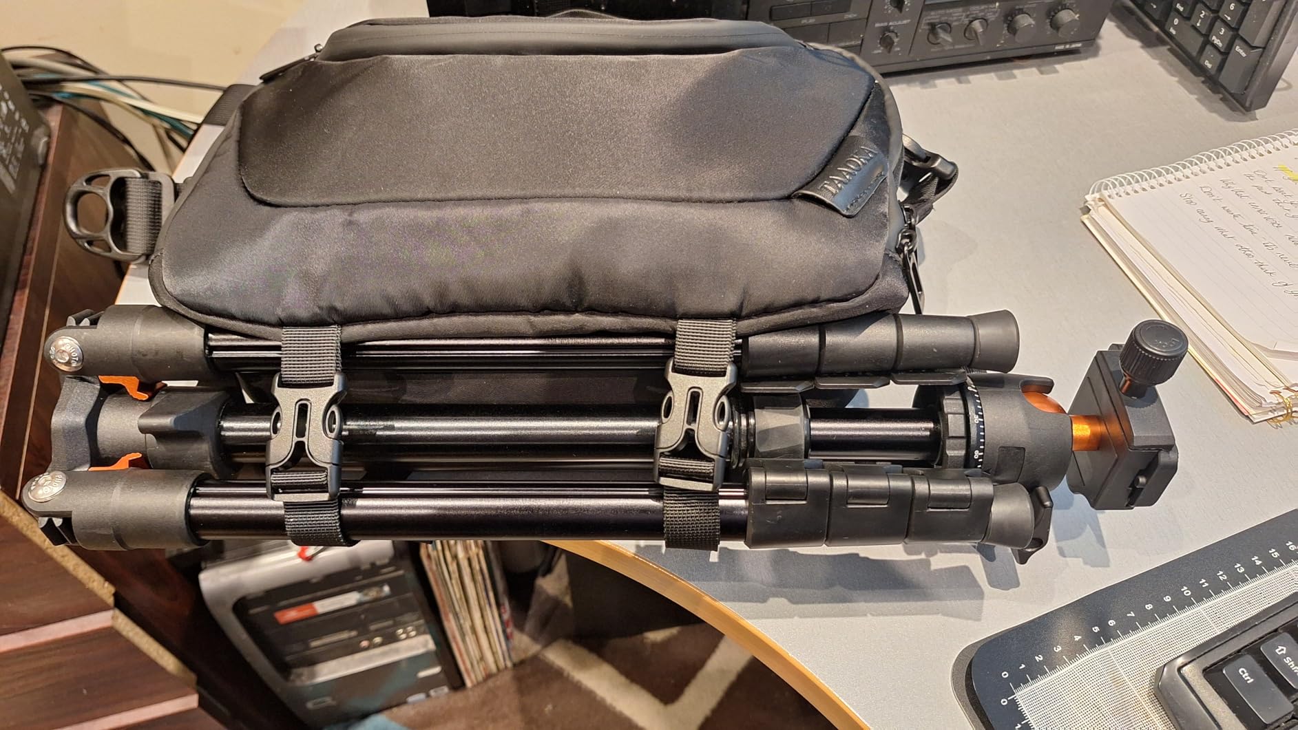 I recently bought a small camera bag with straps on the bottom that I could secure a tripod to - the problem? Mine was miles too big.