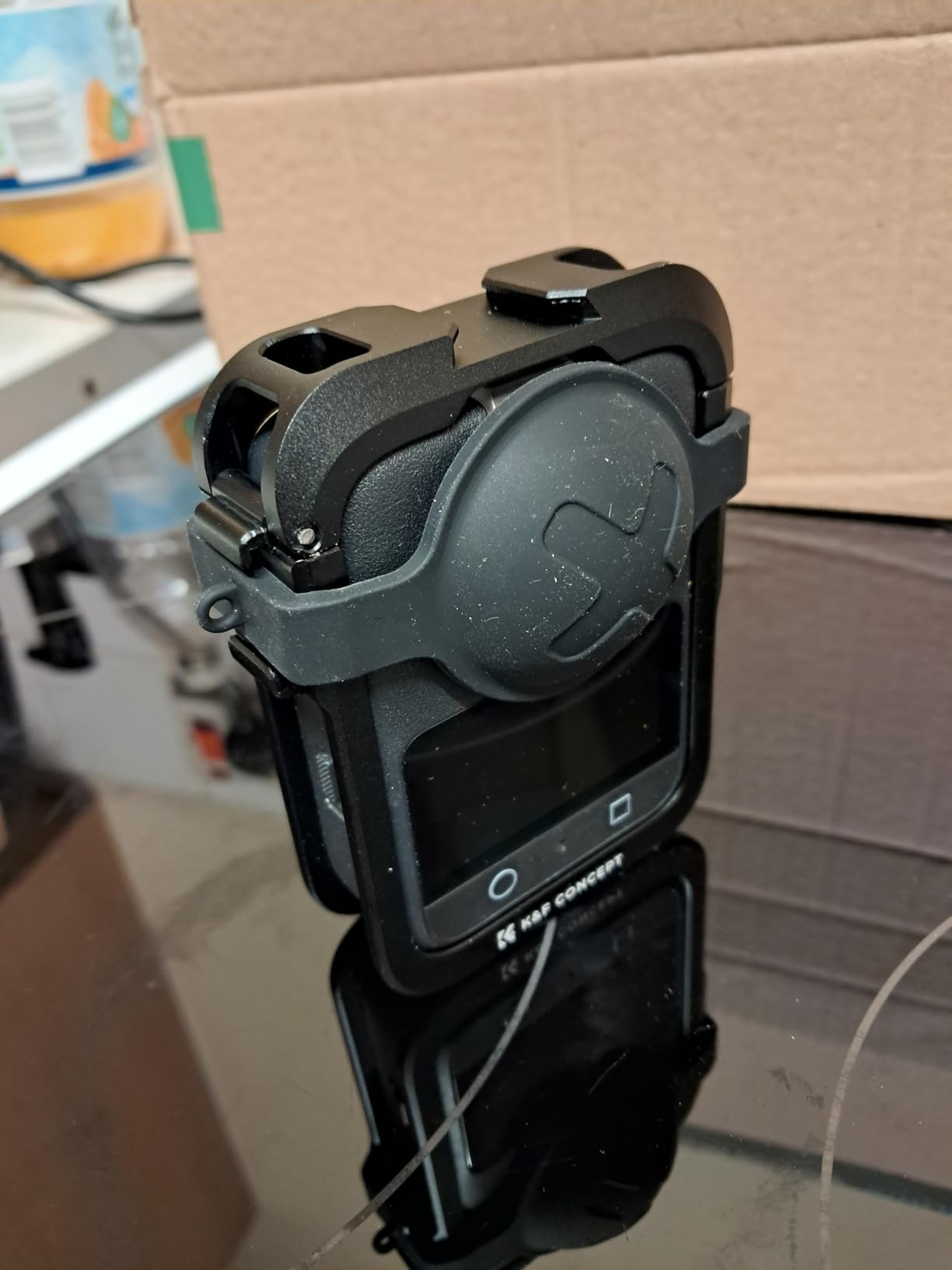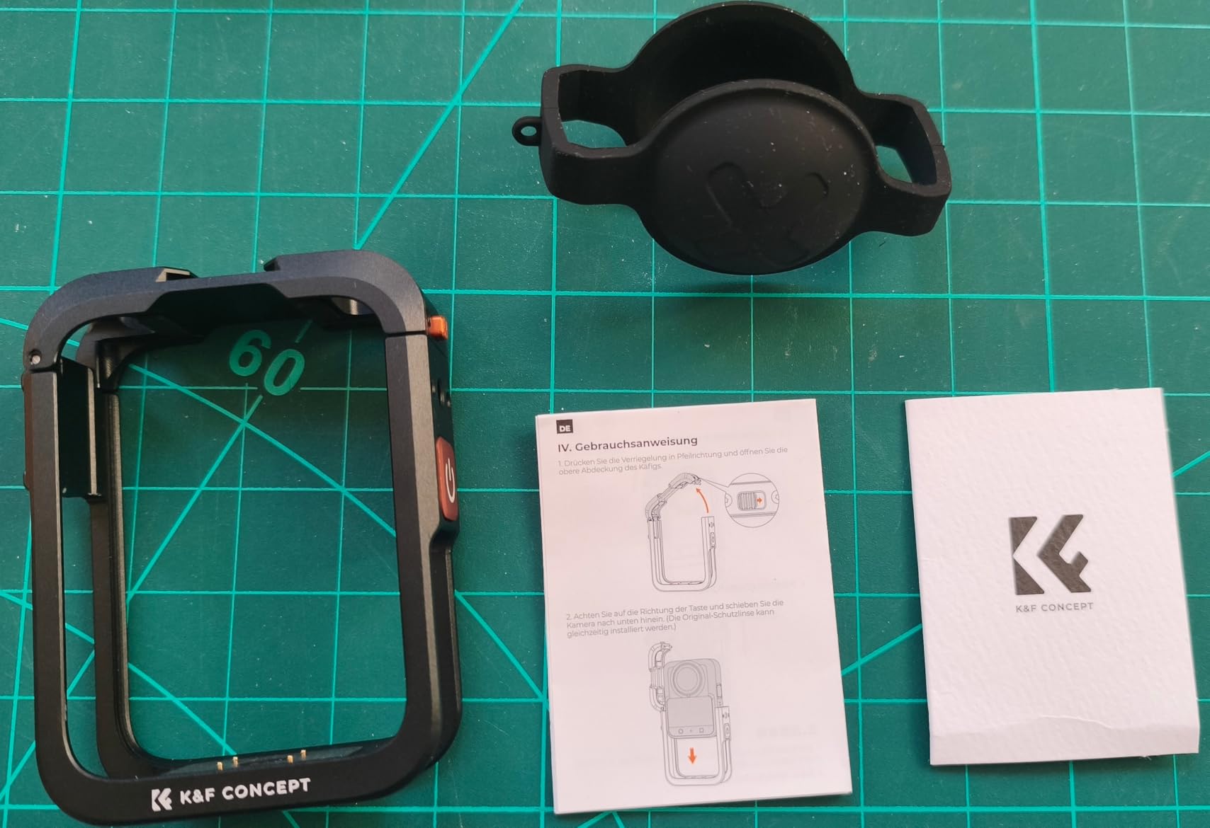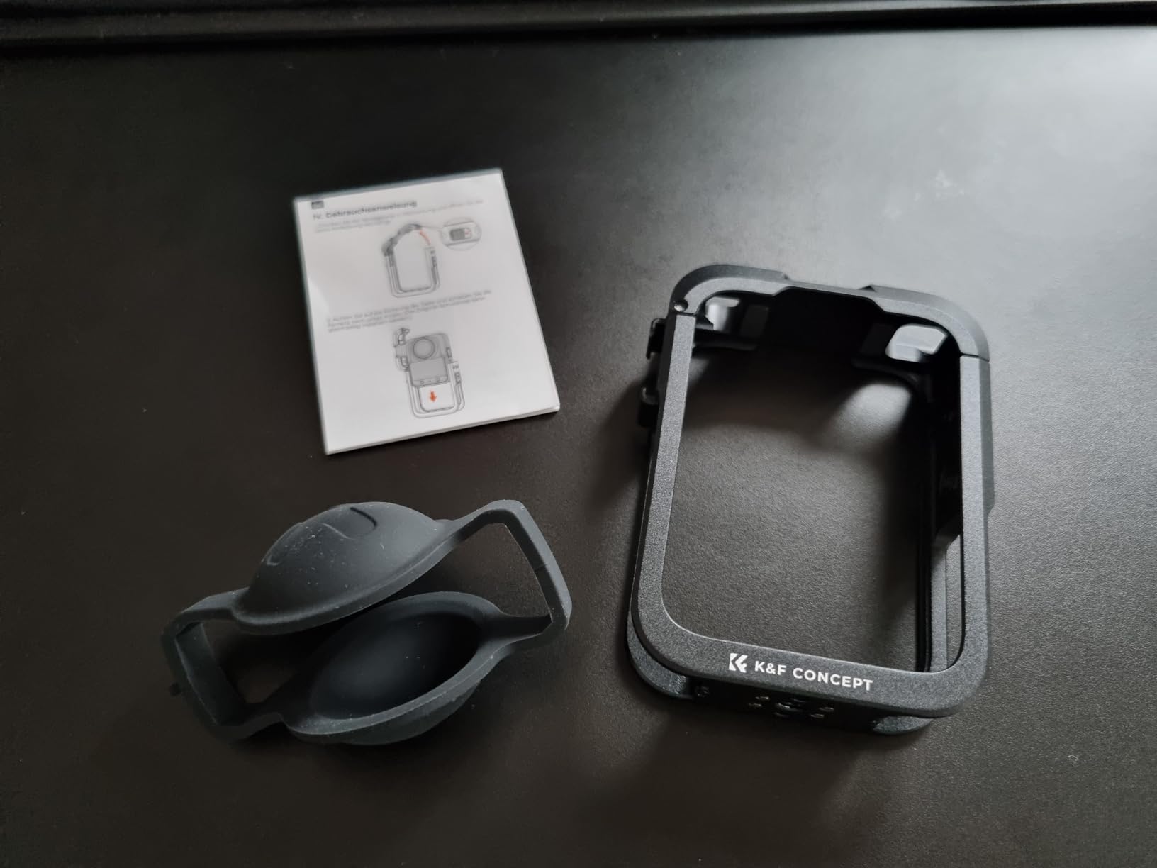 The K&F CONCEPT camera cage for DJI Osmo 360 arrived quickly and well packaged. I find it positive that larger silicone covers are included directly, as the originals would no longer fit through the cage — this was taken into account. Installing the cage is self-explanatory and works without any problems. The camera is easy to insert and sits absolutely securely after closing, nothing wobbles, and the shutter locks reliably.