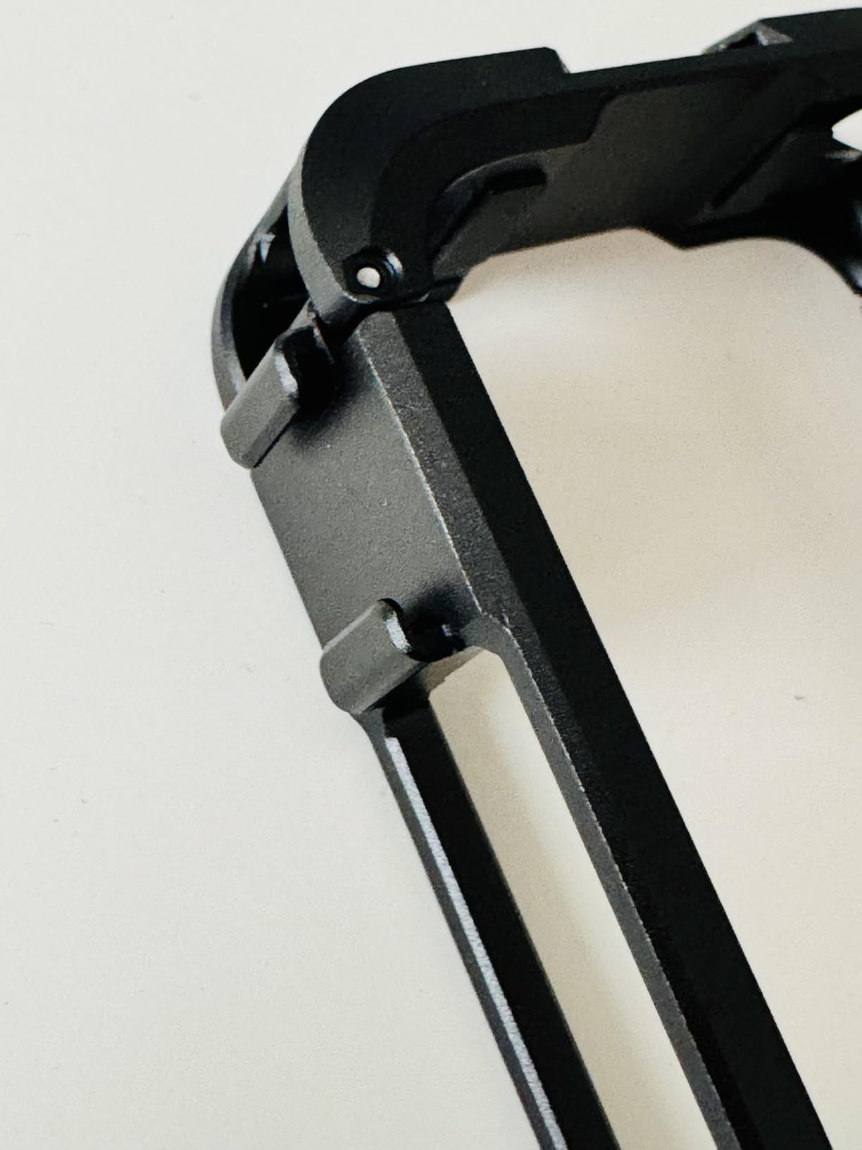 The cage, on the other hand, fits perfectly and is closed with just one snap. The mechanism is as simple as it is safe. The great workmanship is immediately noticeable again, the metal is neatly processed and deburred, thick enough to actually provide protection, but not particularly heavy. The color accents on the closure and the functional button are successful visual highlights.