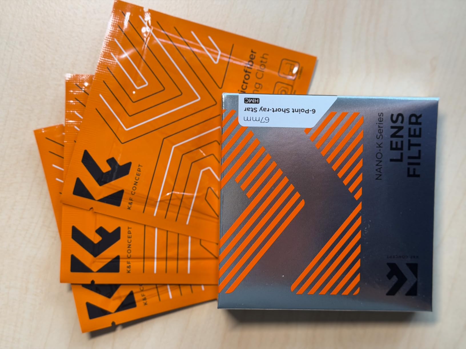 The K&F Concept 6-Point Starburst Filter arrived packaged in a simple plastic case inside a cardboard box, and included three individually wrapped cleaning cloths.