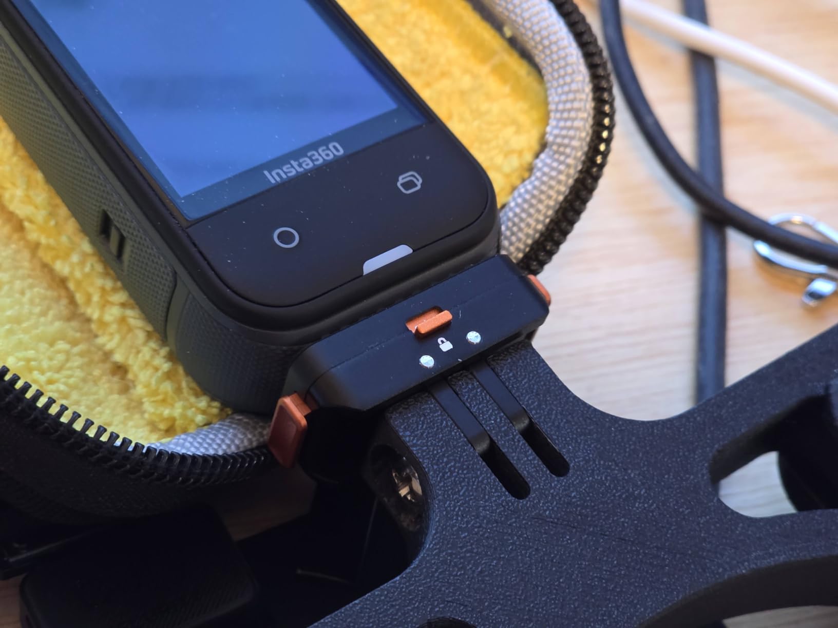 I tested it on the Insta360 Ace Pro 2 and also on the X5, using both the GoPro adapter and the 1/4" thread. The installation is intuitive and reversible, allowing the orientation to be adjusted according to the type of socket. In my case, I mounted it on the bike's handlebar and also on a helmet, and in both scenarios it stayed firm, without play or unwanted movements.