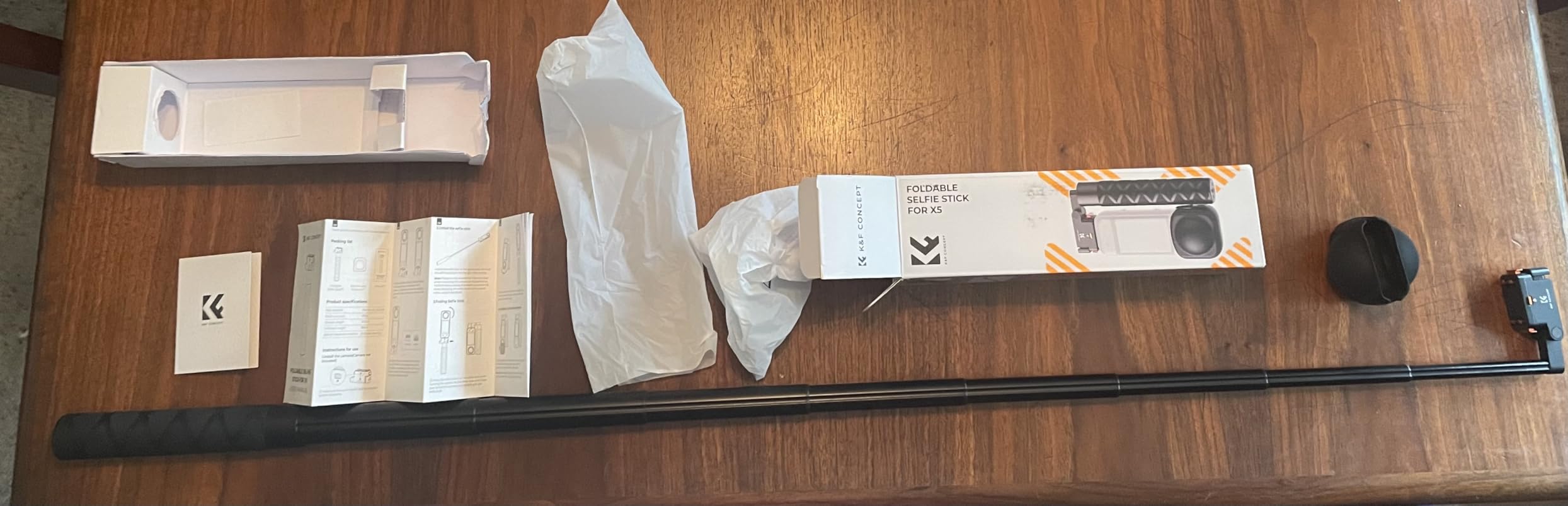 Whenever I'm using 360 cameras, I usually use it with an extra long selfie stick. I have several other selfie sticks however, none of the fold away like this one. K&F Concept makes amazing camera filters and I'm happy to see they've made a quality foldable selfie stick as well. Being able to pack it away, then unfold and extend may give me more reasons to use something shorter that what I'm used to. The stick is very sturdy and doesn't wobble at full length. Also comes with a lens cap. I like how you can lock down the camera onto the selfie stick however, I wish there were a way to lock this contraption in place when folded.The reason I'm giving this 4 stars is the price. For the same amount, you can get a few more features from the OEM Insta360 version like a pull-out tripod base and a strap to secure the camera when folded. Other than that, this is a solid accessory for your Insta360 X5. I wonder if they'll make one for the Osmo 360