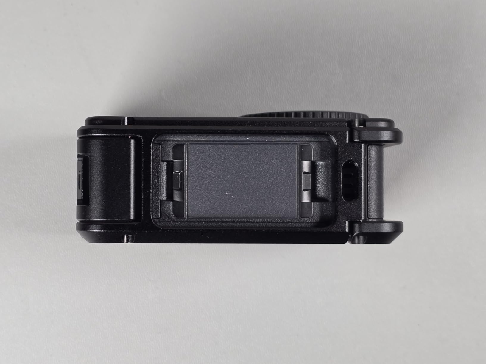Even the quick battery change was thought of here. With a push button, which for once is not marked orange, the base plate can be unlocked on the right and then folded upwards, which allows access to the battery compartment. Cleverly done, albeit a bit complex.