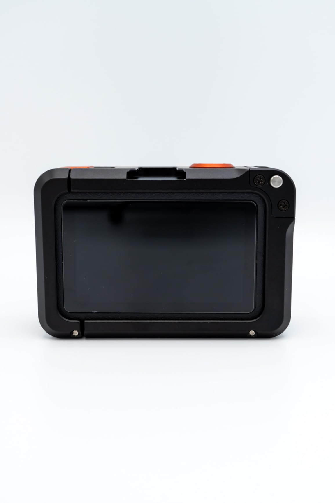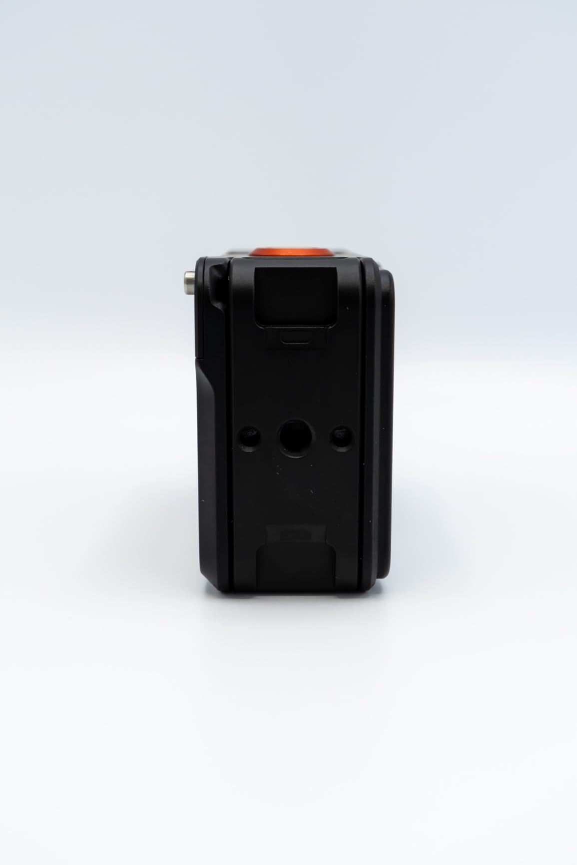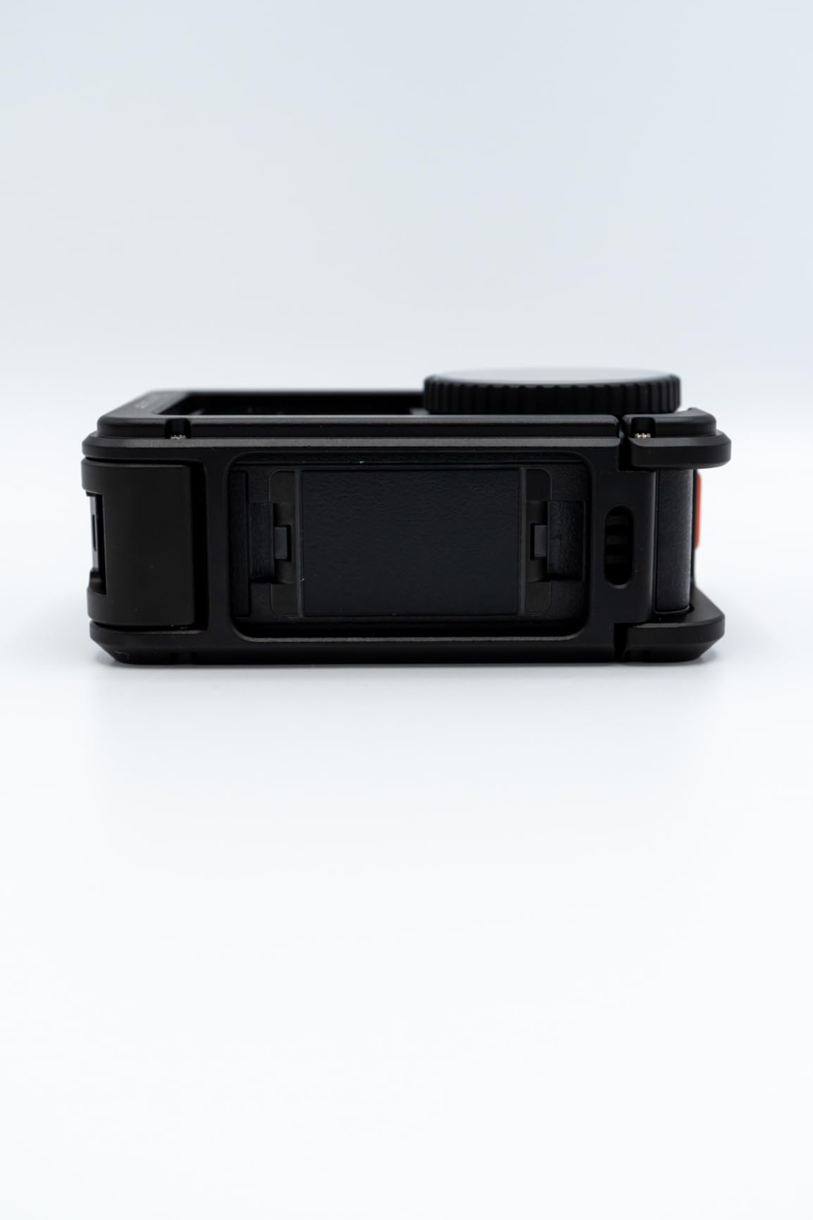 The buttons are also made of metal — but that also makes them wobble a bit. But that is also the only point of criticism — everything else is really cleverly thought out. At the bottom, there is an opening for the dual action mount of the camera itself. There is another dual action mount on the side, which also has a thread for a tripod. And it can be folded out to access the battery and memory card without taking the camera out of the frame — great! The USB port is also accessible, as there is a recess in the frame.