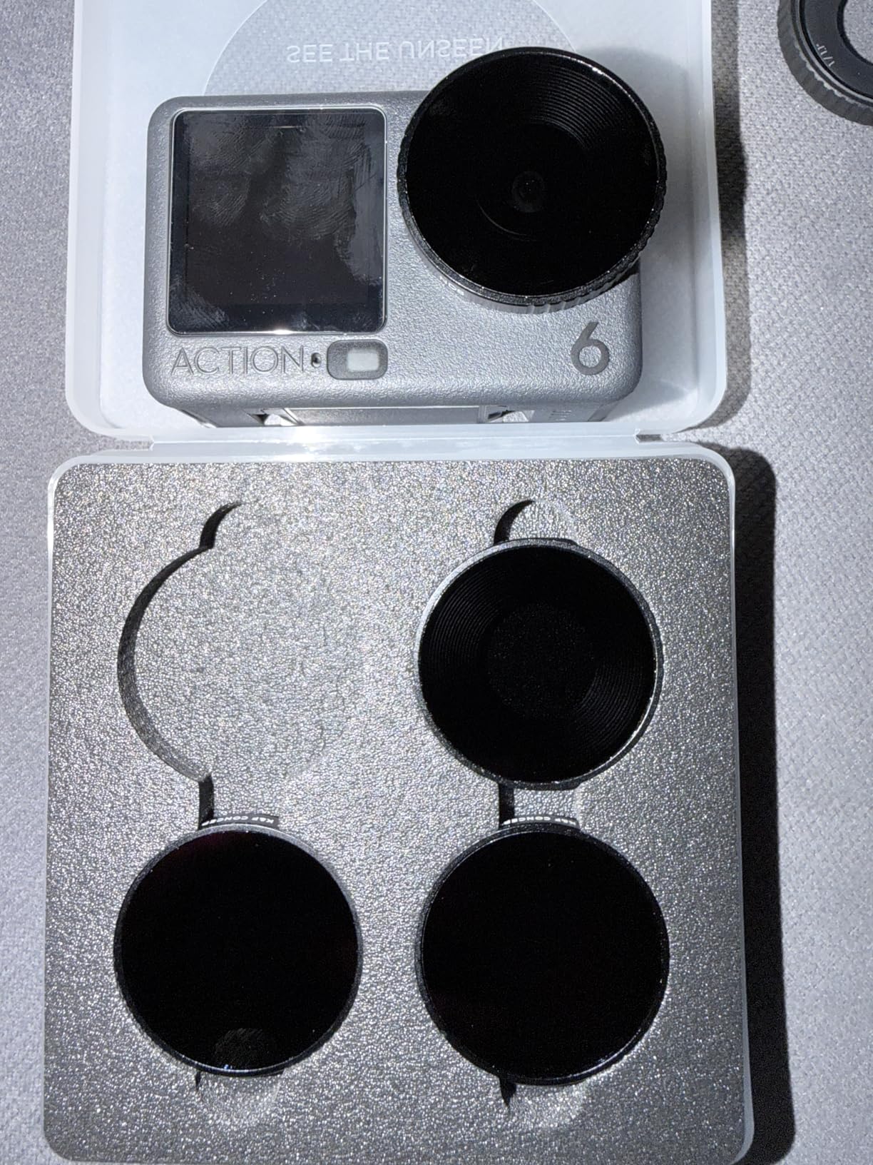 Es handelt sich um ein qualitativ hochwertiges Set. Jeder Filter ist robust und elegant und verfügt über präzise gefräste Schraubgewinde, die perfekt auf das Objektiv des Action 6 passen. Die Linse an jedem Filter ist klar und frei von Spuren oder Kratzern. Wenn sie nicht benutzt werden, werden sie ordentlich in einer praktischen Tasche aufbewahrt, die problemlos in eine Kameratasche passt.