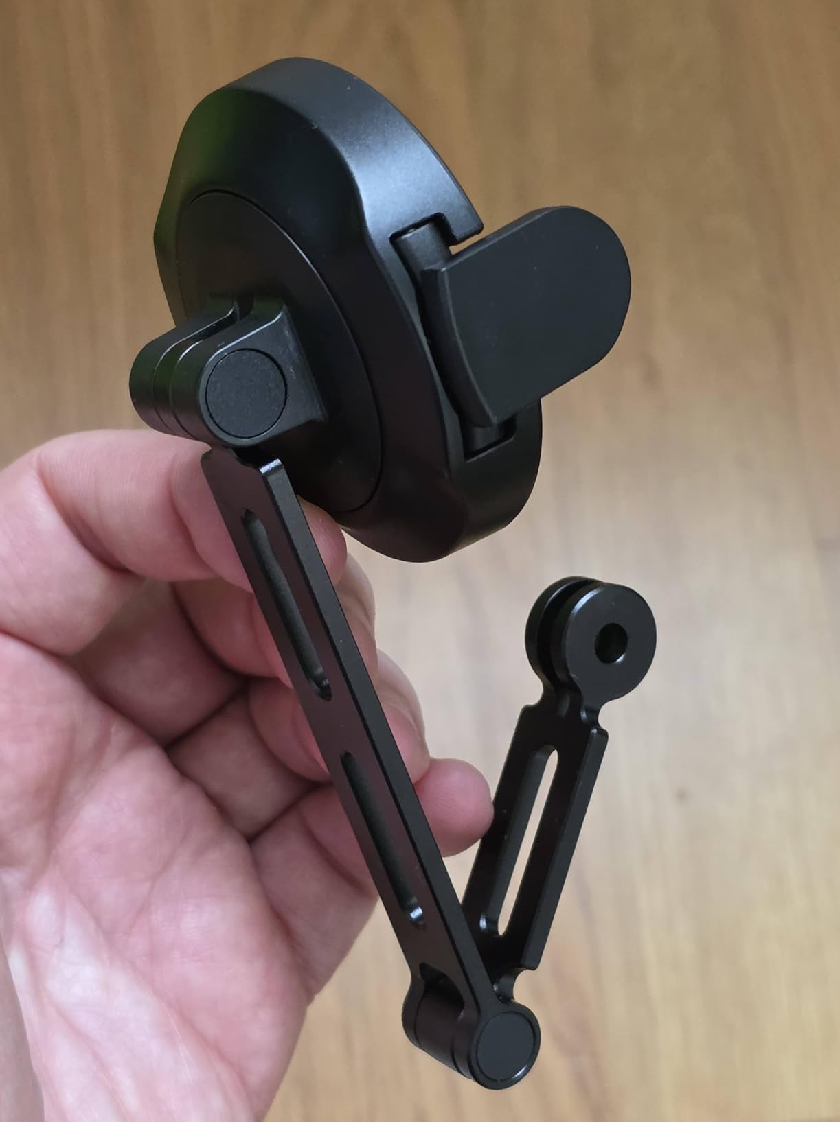 Where so many others failed, k&F here got it right. The fold out extension arm to the device holding magnet, is strong, aluminium, and of useful length. It allows me to adjust the camera logically, where I don't need to arc my back to get the right balance of target angle and viewing.In case your phone doesn't have a ferrous ring for the magnet, this holder has fold out tabs to reveal a string loaded phone clamp.