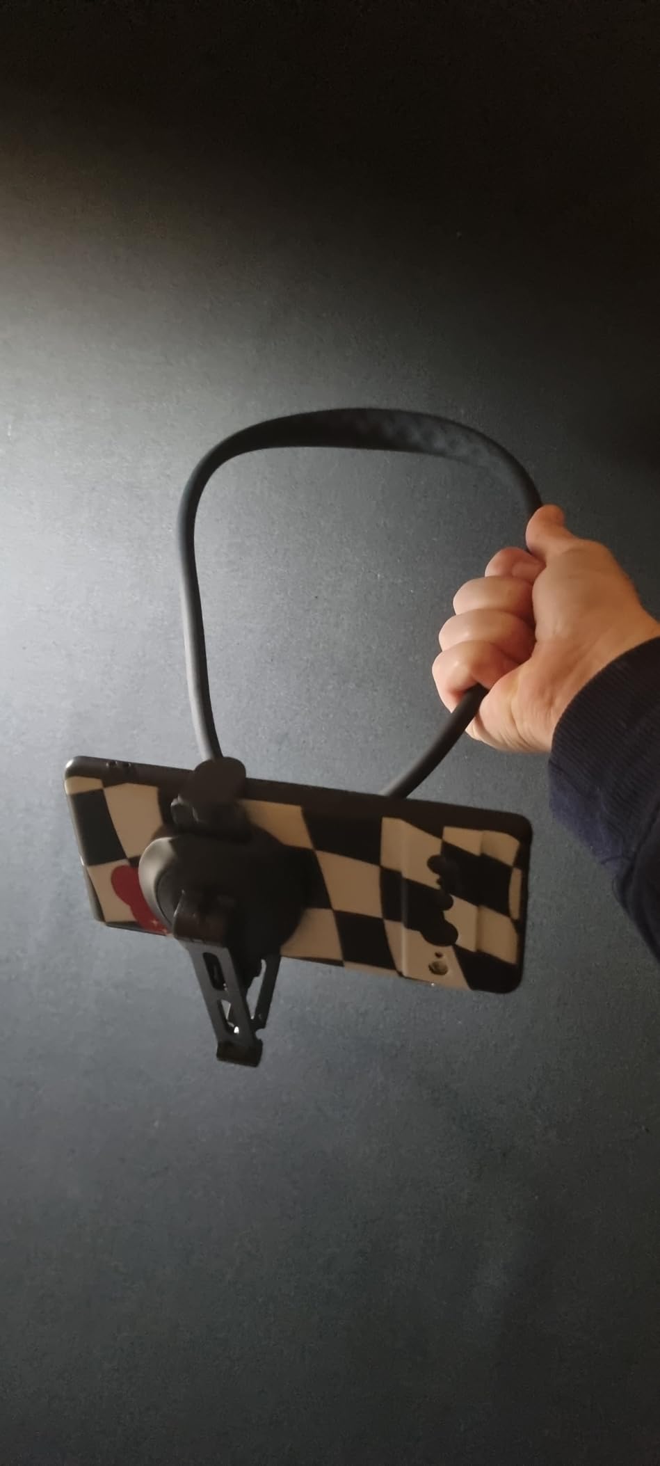 Handy accessory for the perpetual vlogger. Flexible neck hanging mount for your mobile phone. Designed with magnetic mounting in mind, but has spring loaded side clamps as well, for added security. The clamps do take a bit of opening up from their folded position, as there doesn’t appear to be an easy release. A bit of outward pressure from a thumb gets the job done though.The sturdy loop goes around the wearer’s neck, clipping in to a round chest piece. Attached to that is a hinged bracket with a sturdy mag mount hub. The hinges are stiff to move by design, so you can find a suitable position and keep it there.The mounting hub can be rotated in 90 degree increments, so you can choose portrait or landscape, or even inverted.Further rotation is available from the chest hub, too, so there is quite a lot of flexibility for the position of your phone.Also provided is a fabric strap, which can be fasted to the chest hub for added stability. Then there is a wrist-strap for phones with provision to tie it through, and the loop of the strap could then be hung on the assembly to further protect your handset should it come free of the mag mount.Designed to give you a hands-free point-of-view outlook when filming your surroundings, streaming on media platforms, or I guess, watching random videos.Sturdy product that would likely be redundant for those of you with chest mount action cameras, but a great way to accessorise your mobile and avoid having the expense of another device.