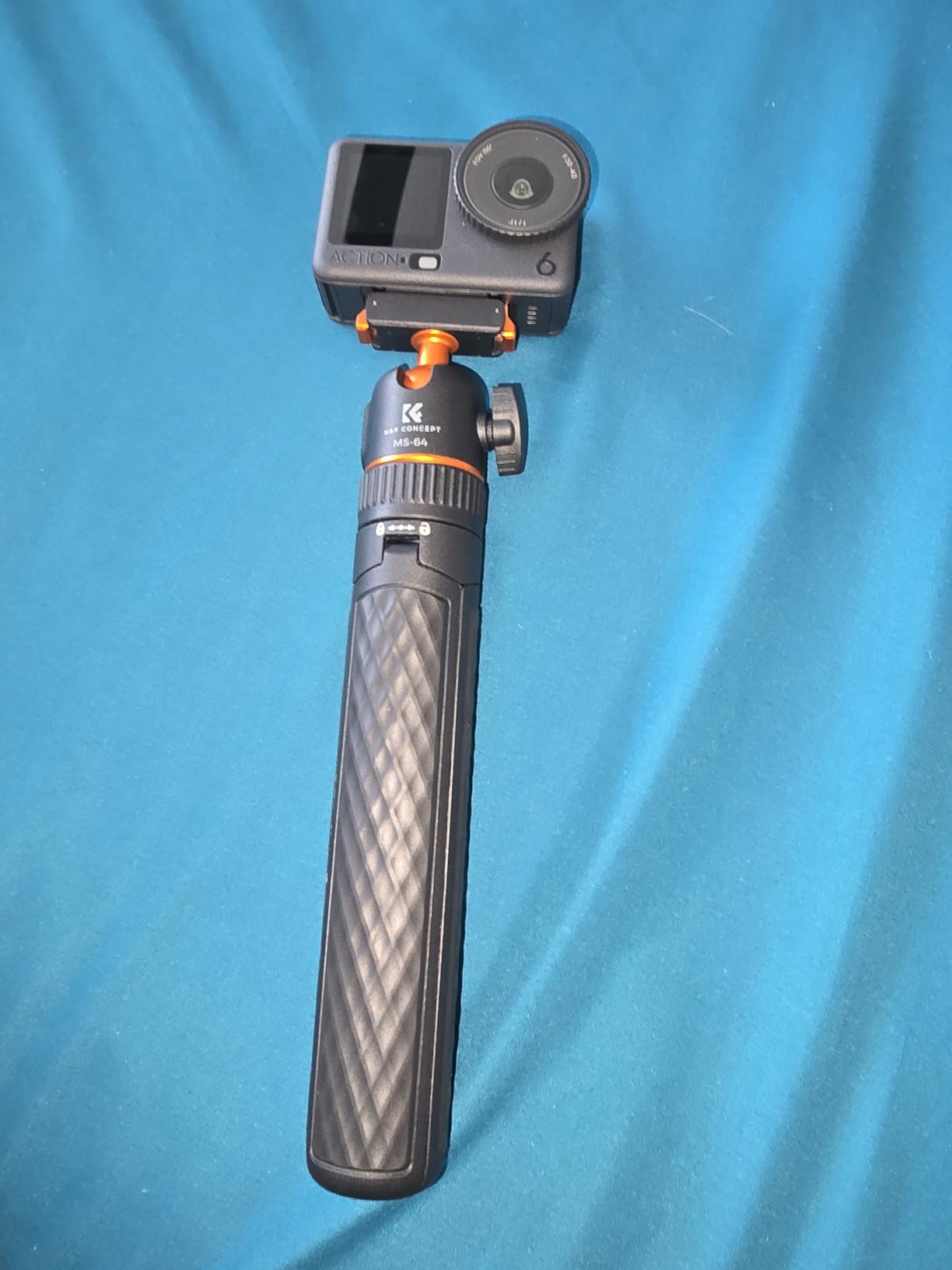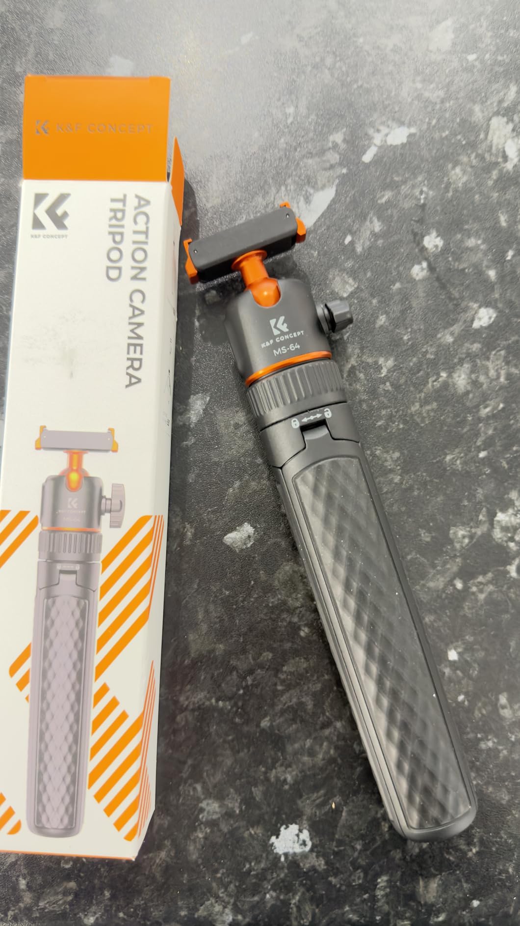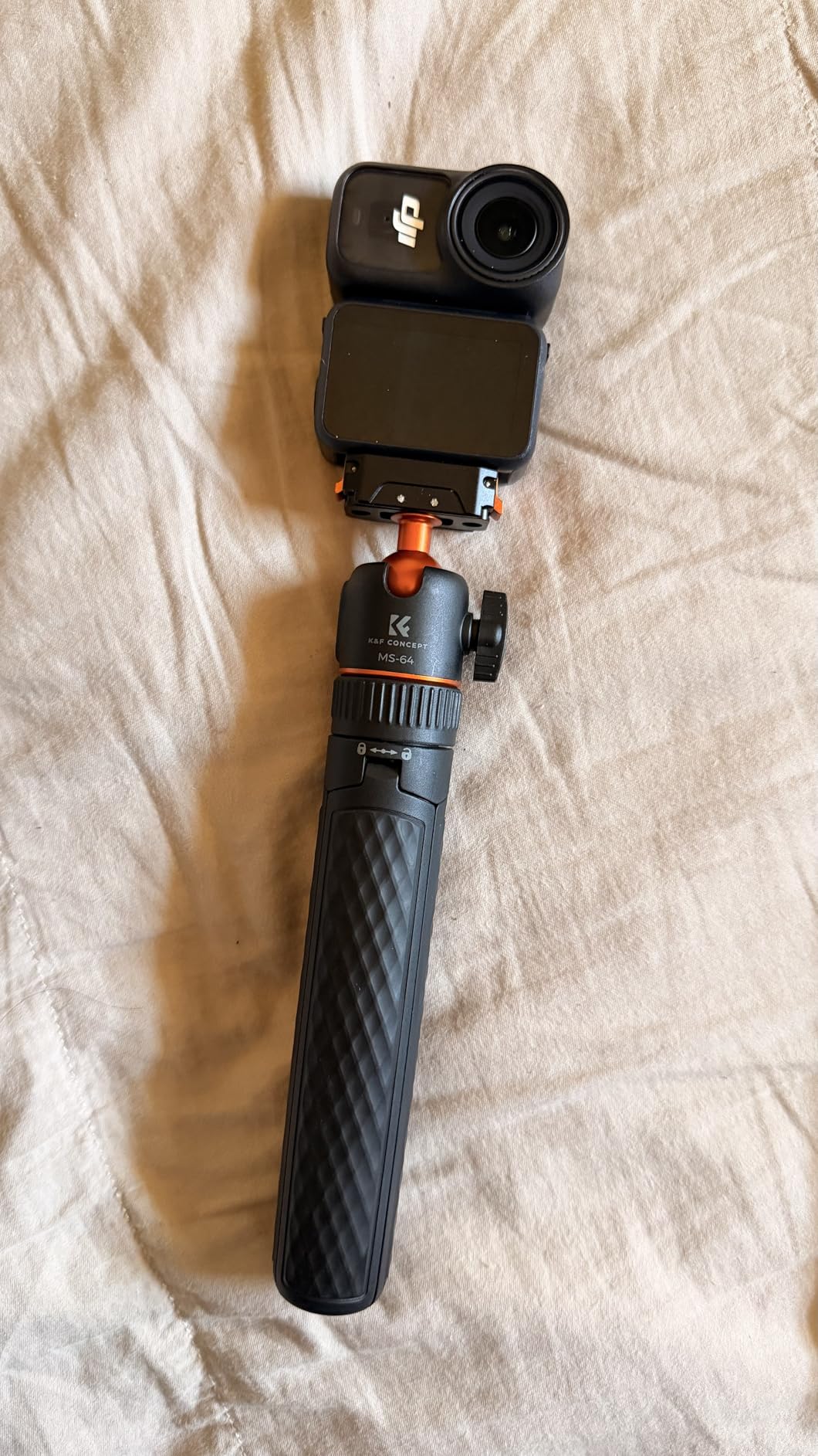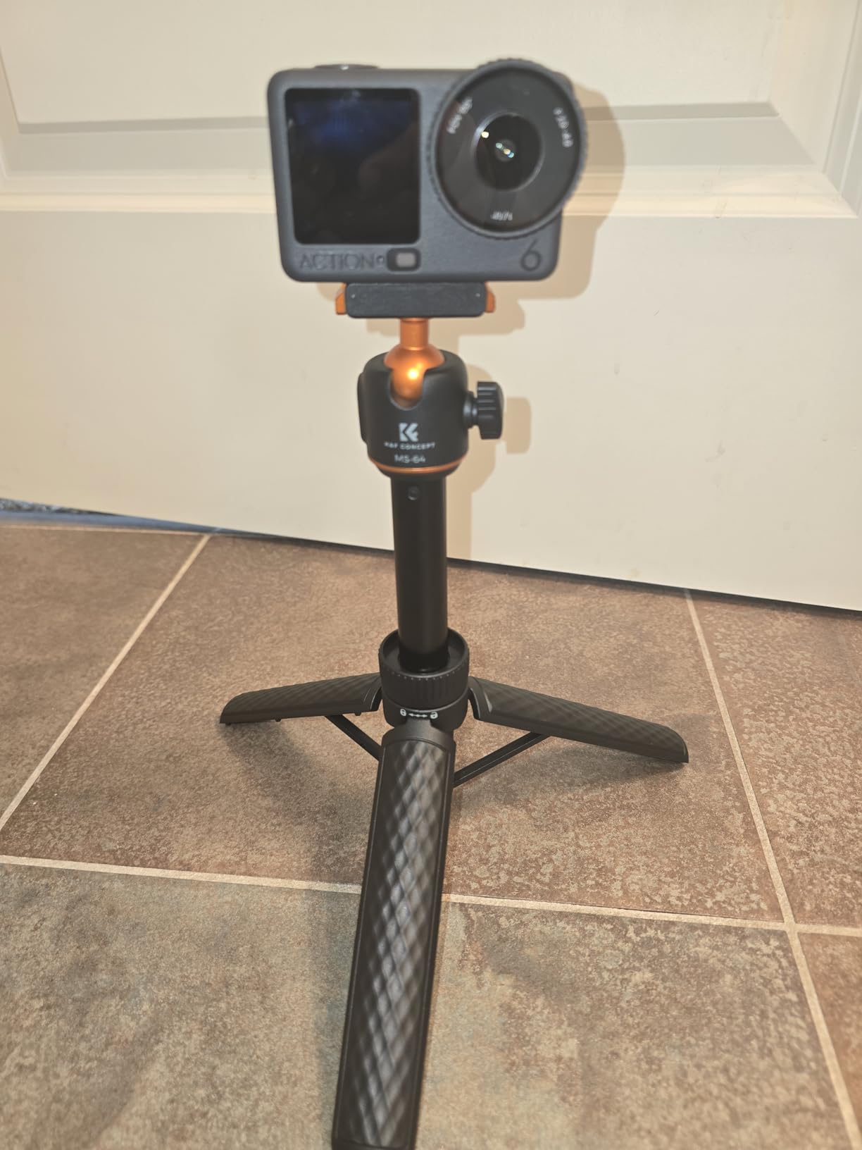 I've been using the K&F CONCEPT 65cm/25.6" Mini Tripod Selfie Stick almost daily for the last 2 weeks. I will say that on a level surface, even outdoors, the tripod is stable, even with part of the selfie stick extended (providing the wind isn't too gusty!) and can be placed to capture images with the Action 6 very effectively. (the DJI MIMO App can be used to remotely fire the camera for photos or video) The ball head (in K&F Concept corporate Orange) has some friction when loosened, and holds firmly when tightened.The grip on the tripod is lightly textured, helping to provide a good grip, even when using it as a selfie stick, the lightweight construction, coupled with the very light Action 6, means that 'vlogging' with the combination is not particularly tiring for the arm! The effectiveness of the Quick Release bracket (push it on firmly until both sides click into place) also inspires confidence that the camera will not tumble to the ground if jogged. (the same confidence is apparent when using the tripod selfie stick to do low-level video, it holds secure even when the camera is upside down)When collapsed the tripod is easily small enough to carry in a pocket, along with the camera, and still have room for a hand in colder weather... There is a locking collar above the fold-out legs that can lock the tripod closed or open, unfolding the legs when unlocked requires a small amount of force to pass the click-lock, when closing, there is a gentle click when the legs have completely closed. As mentioned earlier, the QR plate locks in place securely, aided by the magnet built in to it.At the time of writing the tripod is £25, which I consider reasonably inexpensive for a photographic accessory, particularly noting that K&F Concept typically produce good quality products at a wallet-friendly price, and this feels good quality.