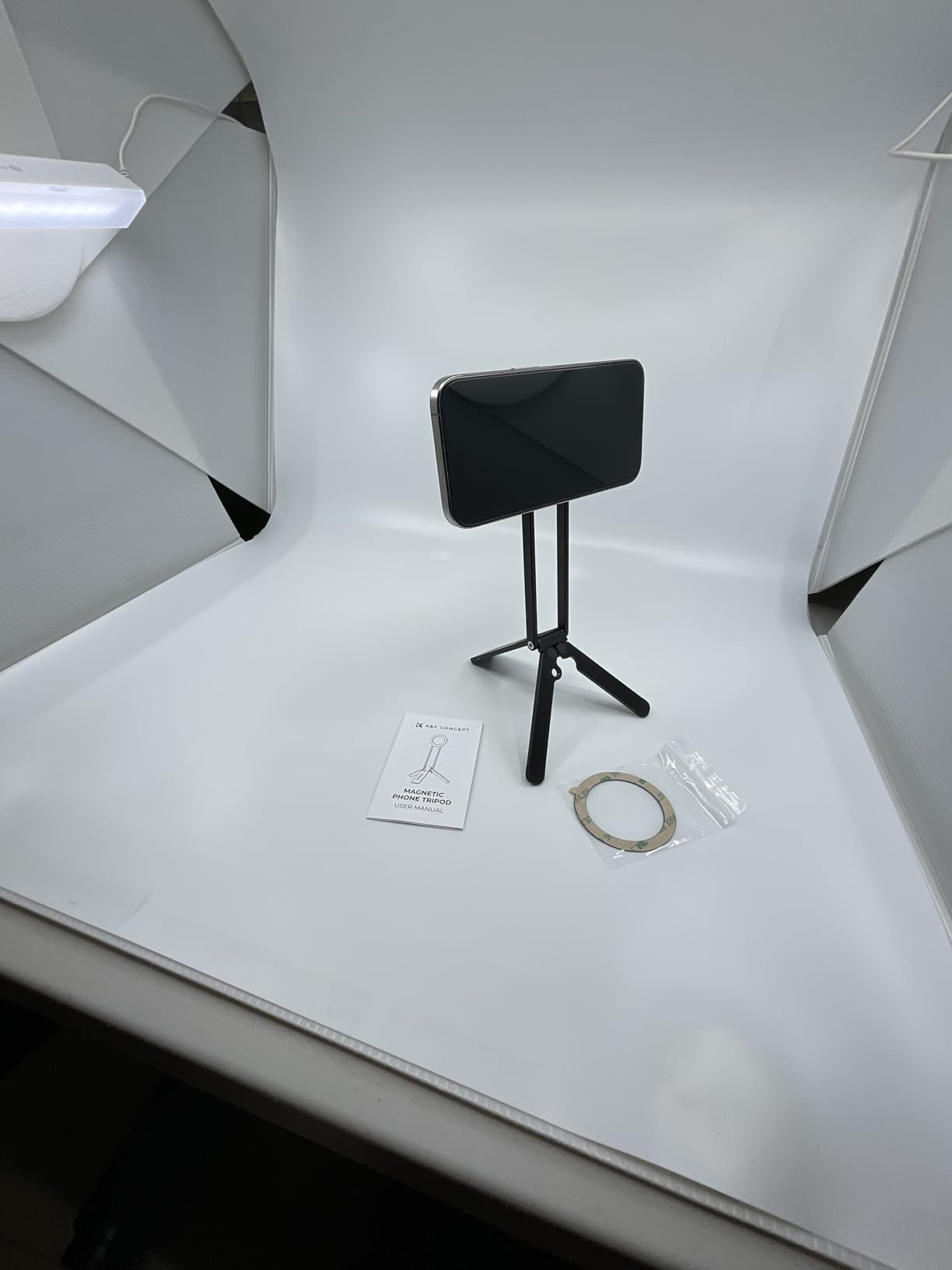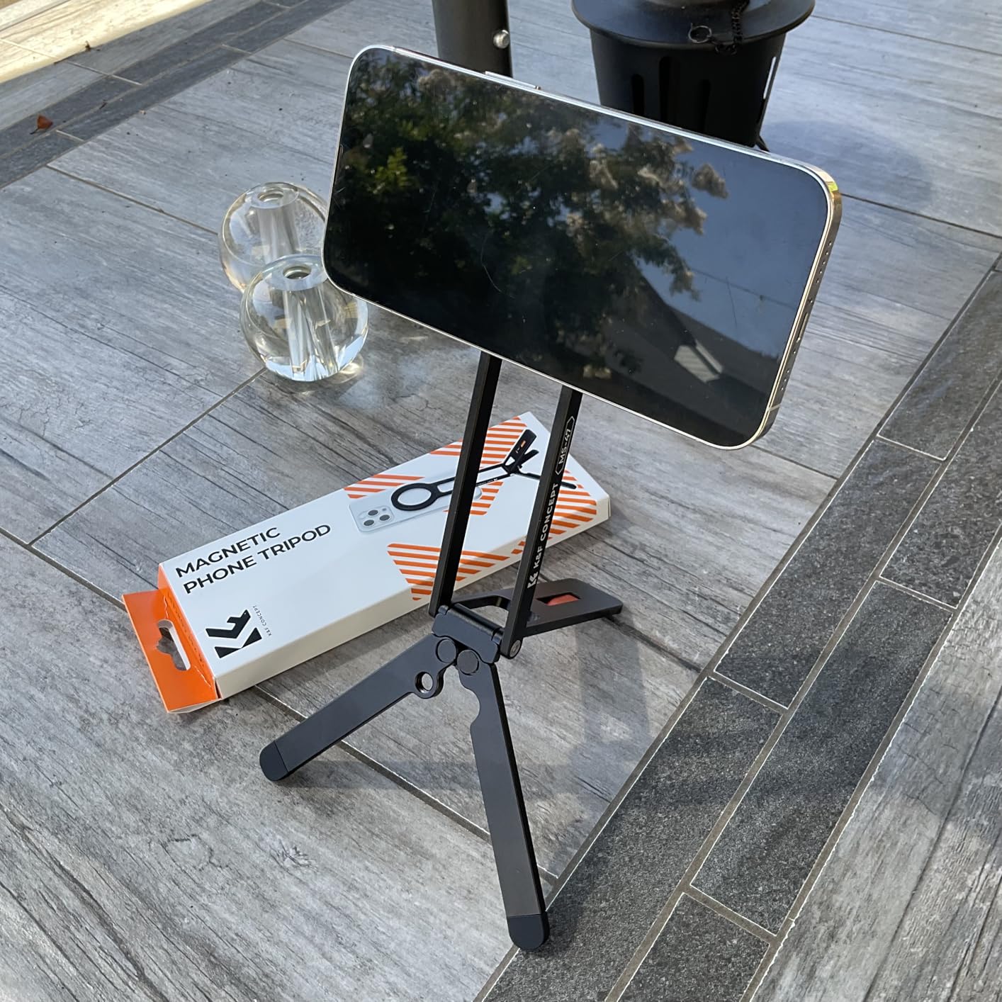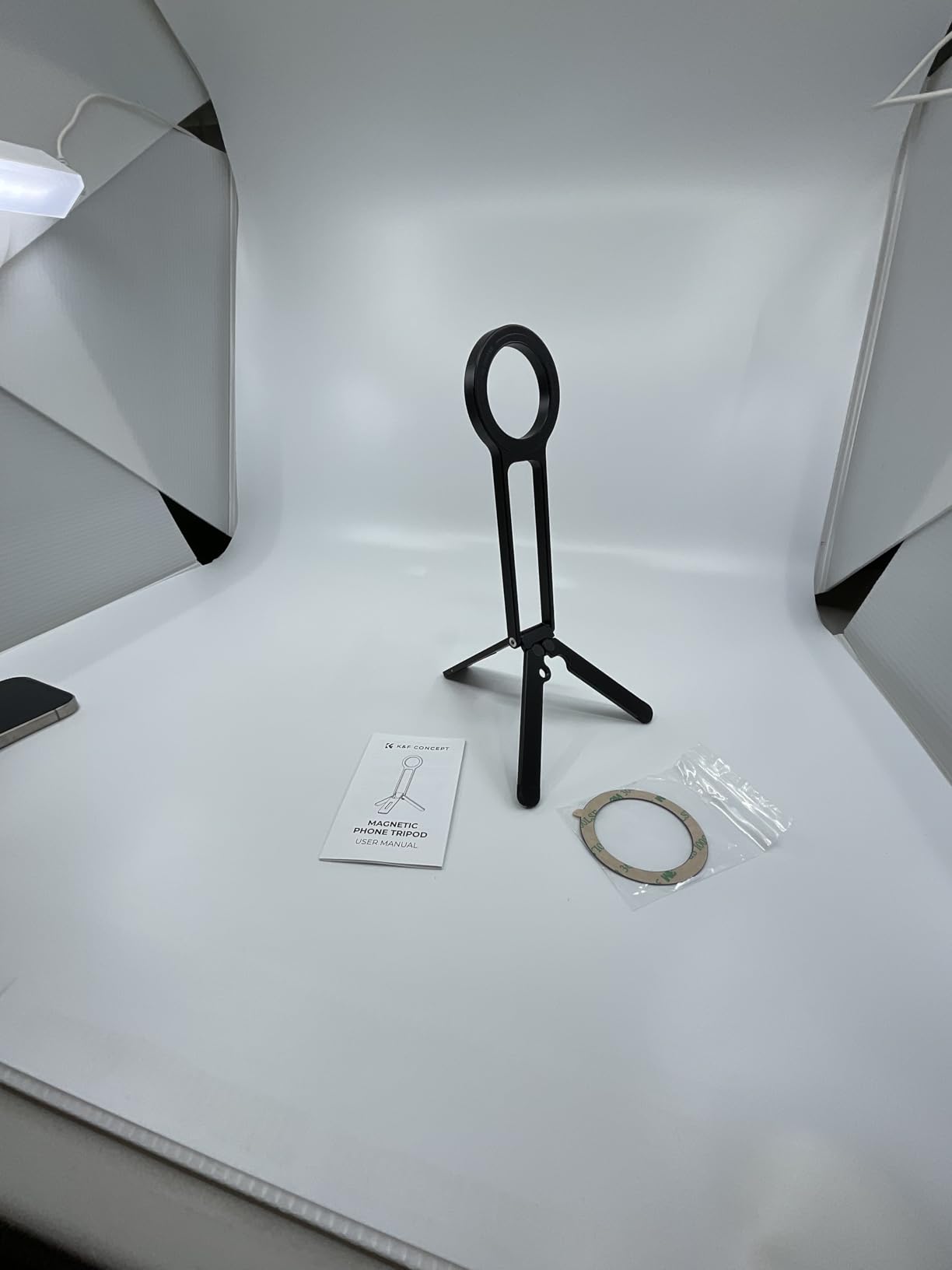 I couldn't be more excited about my new K&F Concept Phone Tripod! This comes nicely packaged, great if you're gifting. Included are the phone tri-pod, a QR code for warranty information, a self adhesive magnetic ring for phone cases lacking a magnetic ring and an instruction manual that is well illustrated and in several languages.Upon unboxing I was immediately impressed with the build quality of the all aluminum alloy unit. The stand is very light but also very strong and sturdy. The fold out legs have silicone pads to prevent slipping on smooth surfaces. Also of note is ¼ inch screw hole that enables use on a full size trip-pod if needed. The MagSafe magnet has PLENTY of strength and I'm at ease knowing my phone is secure. This is a quality portable stand that fits easily in my pocket and weighs in at just under 3 ½ ounces. I've included photos to illustrate size and uses. I look forward to utilizing this handy device for future vlogging, group selfies, landscape photography and more.