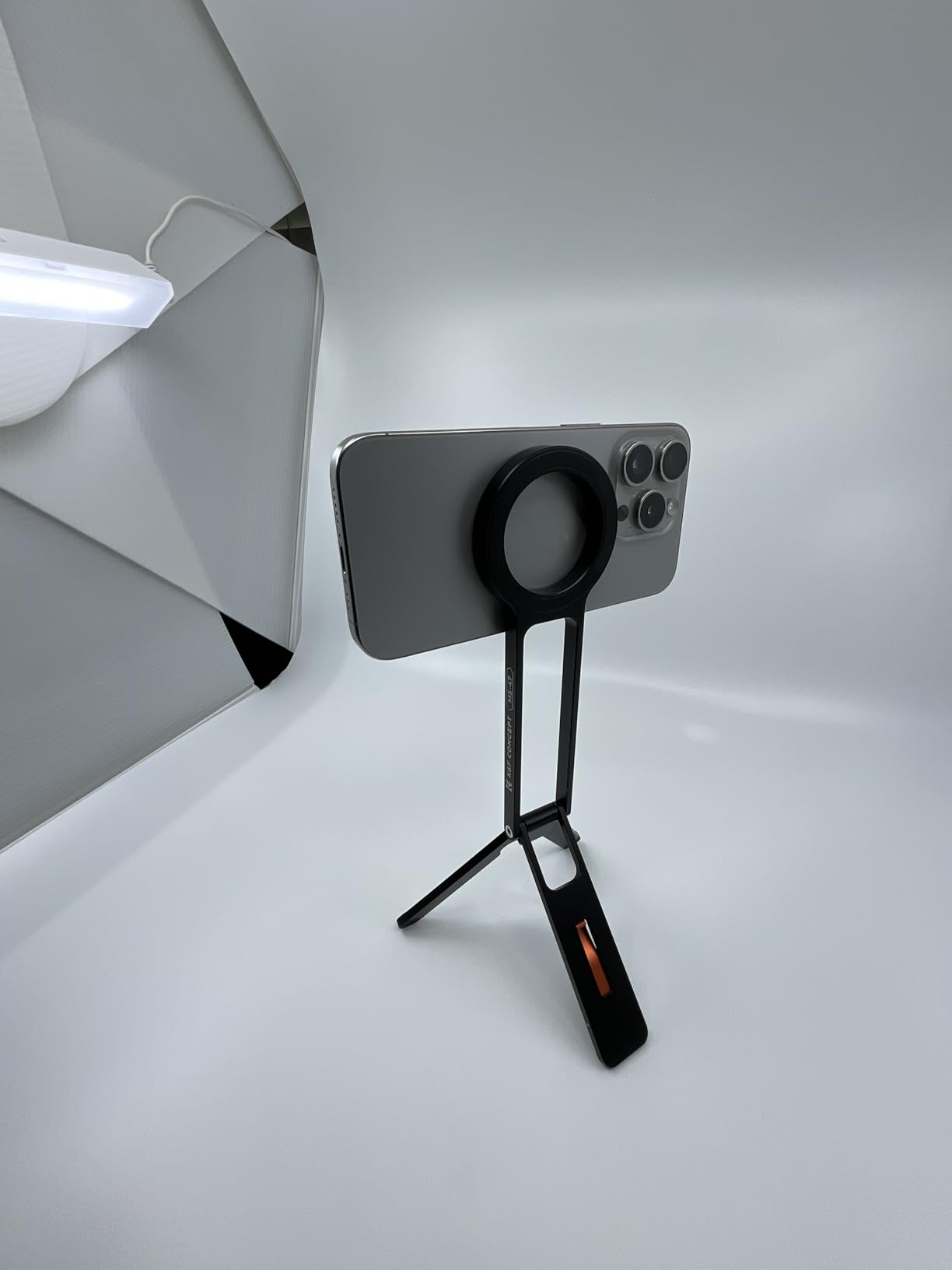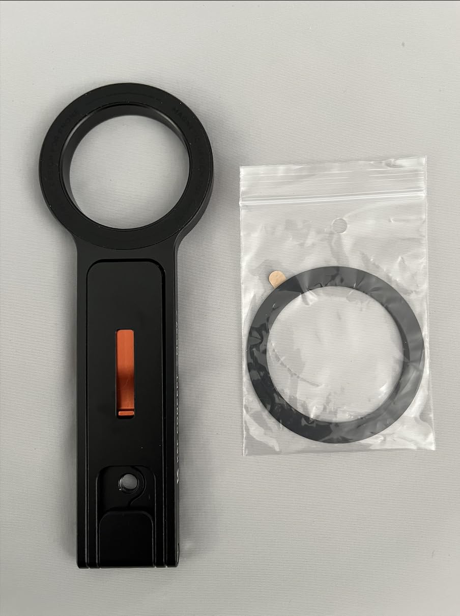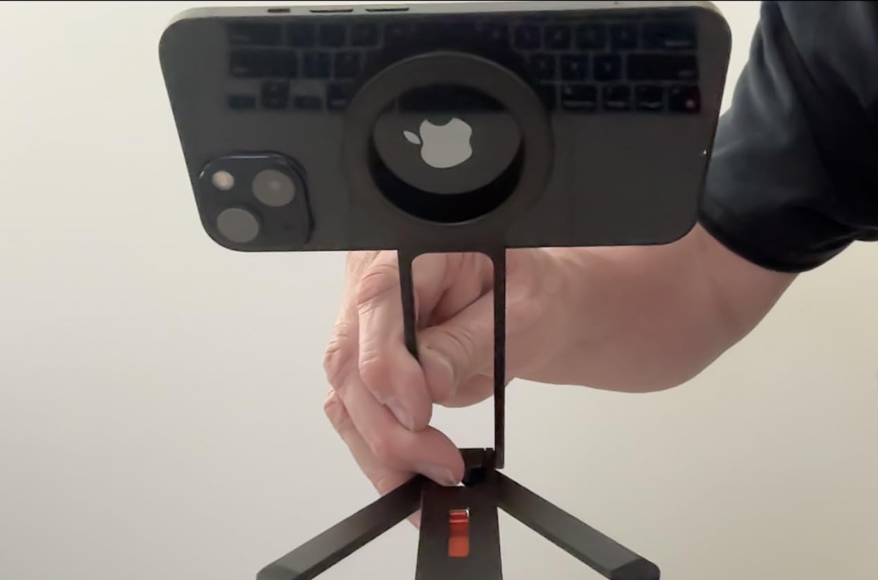 This is a beautifully engineered chunk of metal, its quality matching classical photography equipment. The MagSafe ring allows a phone to be attached at any angle, horizontal, vertical, or anywhere in between. Given that amount of adjustment and two legs which can swing out at different angles, you’re pretty much covered for any angle you want to set up on a horizontal surface — excepting if you want the phone to lean over more than 45˚. Then it’ll fall over. A dubious little red “mantis hook” is included to help the tripod hang from more vertical surfaces, which I feel is a bit risky. However, I do like that this tripod includes a threaded hole which can connect it to other photographic equipment: Selfie stick, monopod, tripod, camera shoe etc. The package includes an adhesive metal ring to add to a non MagSafe phone, camera, selfie light, or a thick phone cover which inhibits the phone’s own metal ring from sticking fast to the stand. Reasonably priced.
