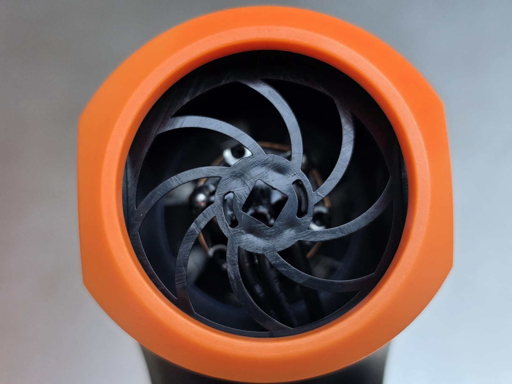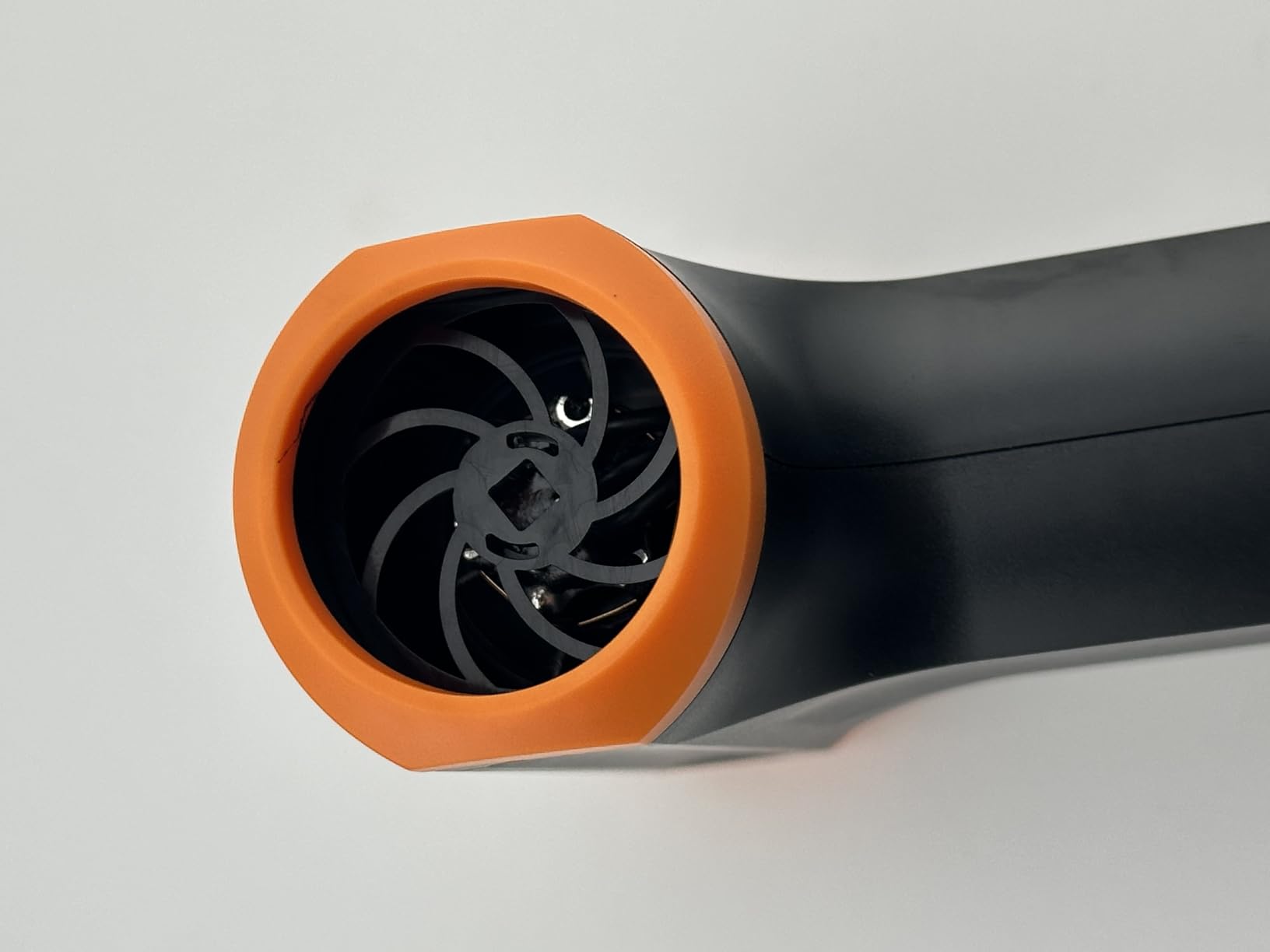 The blower has a completely plastic body, while the air inlet and outlet holes show that the internal blades are made of metal and mounted on a high-speed motor similar to that of RC vehicles.