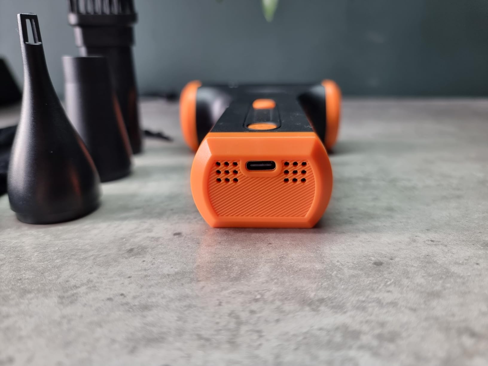 I immediately tested the product using the various nozzles provided. The airflow is really strong, so much so that it barely moves my wrist when turned on at maximum power. There's a slide potentiometer on the handle for speed adjustment, and this is the only sore point with the product, as the potentiometer is too soft and can easily be bumped during use. It's easy to move it to minimum or maximum power. There's a handy on/off button.