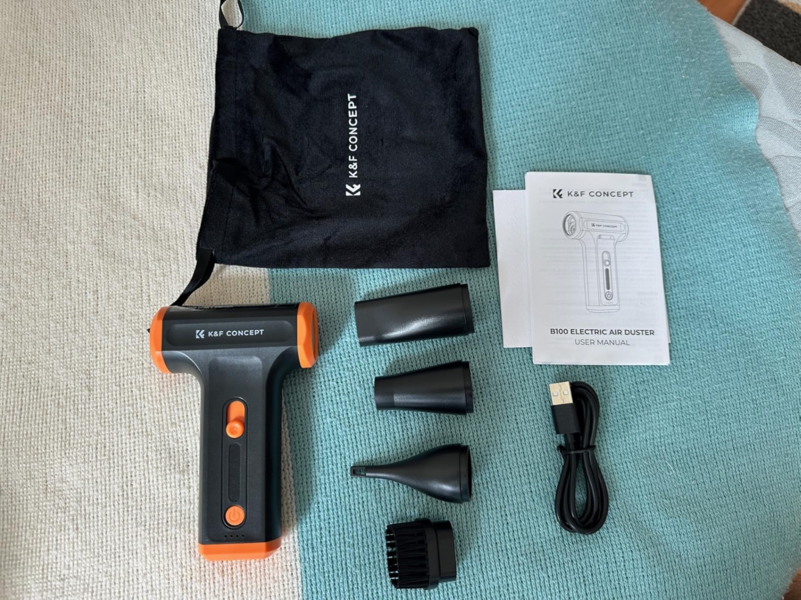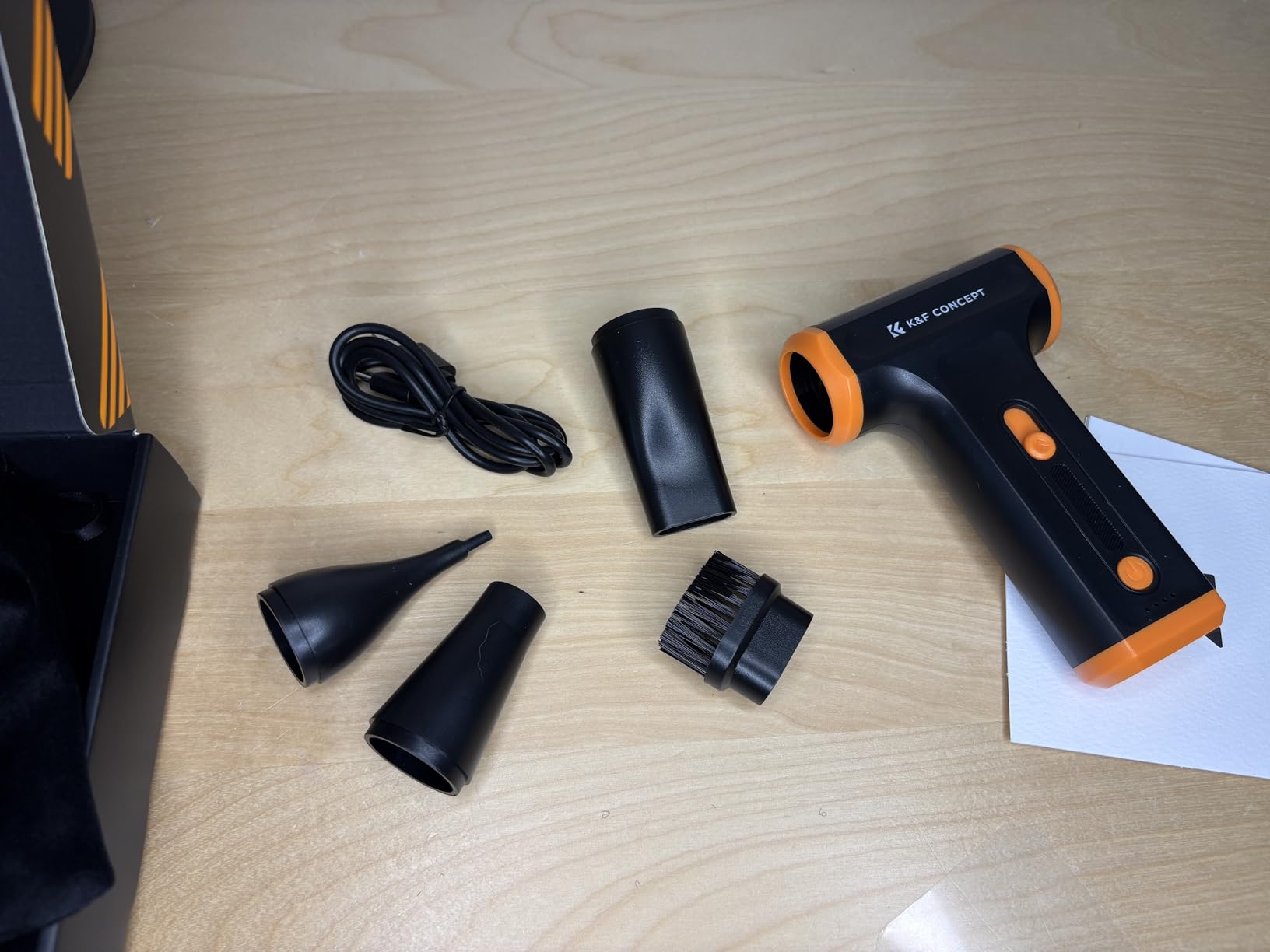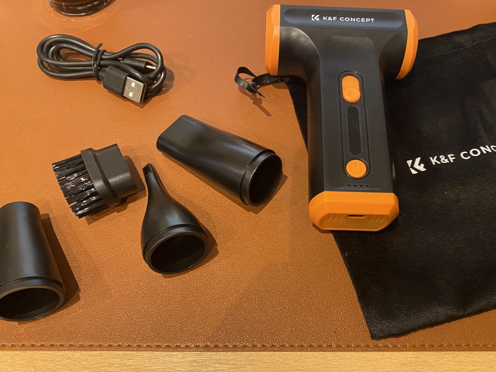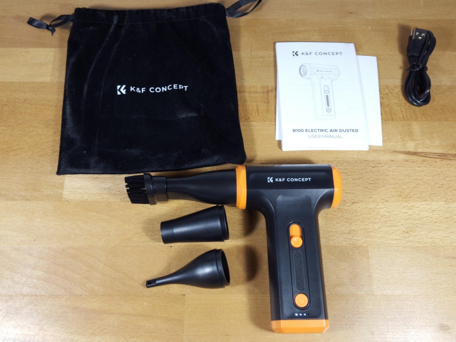 Powerful Air Blower. It's small and easy to use, and its airflow of 110,000 RPM and 80g of power is impressive. It's ideal for cleaning PCs and other electronic devices. It includes three nozzles and three brushes with different configurations for cleaning various surfaces. A single charge is enough to completely clean my desktop PC. It has a charging indicator. It comes with a carrying case and instruction manual.