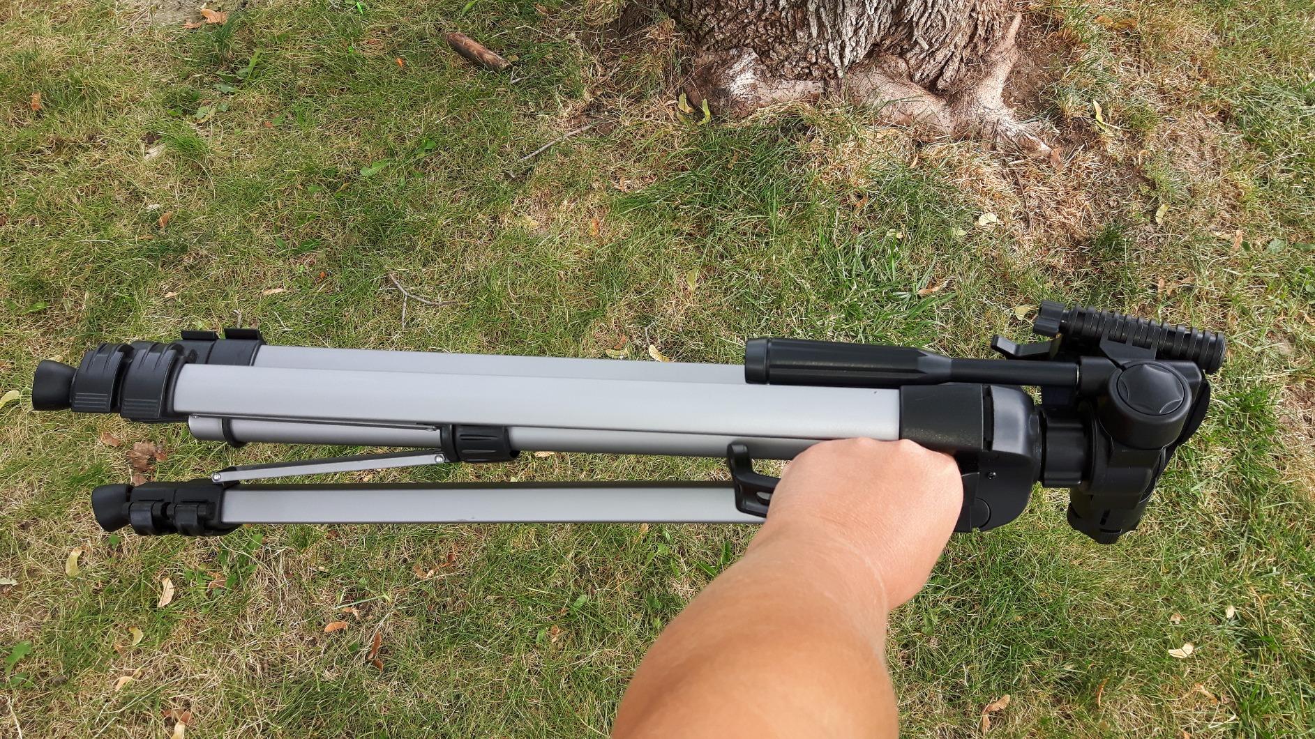 This tripod is quite sturdy and is incredibly light weight. It folds easliy and fits in it carying case very well, making it easy to store. The height is easy to adjust both up and down. I was surprised when I extended the legs and center pole all the way and it went over my head.I love that i can now take family photos with me in them as I can now use the timer on my camera. It also helps me to be steady and get better photos of my crochet items and bath products. It's a great addition to my camera equipment.