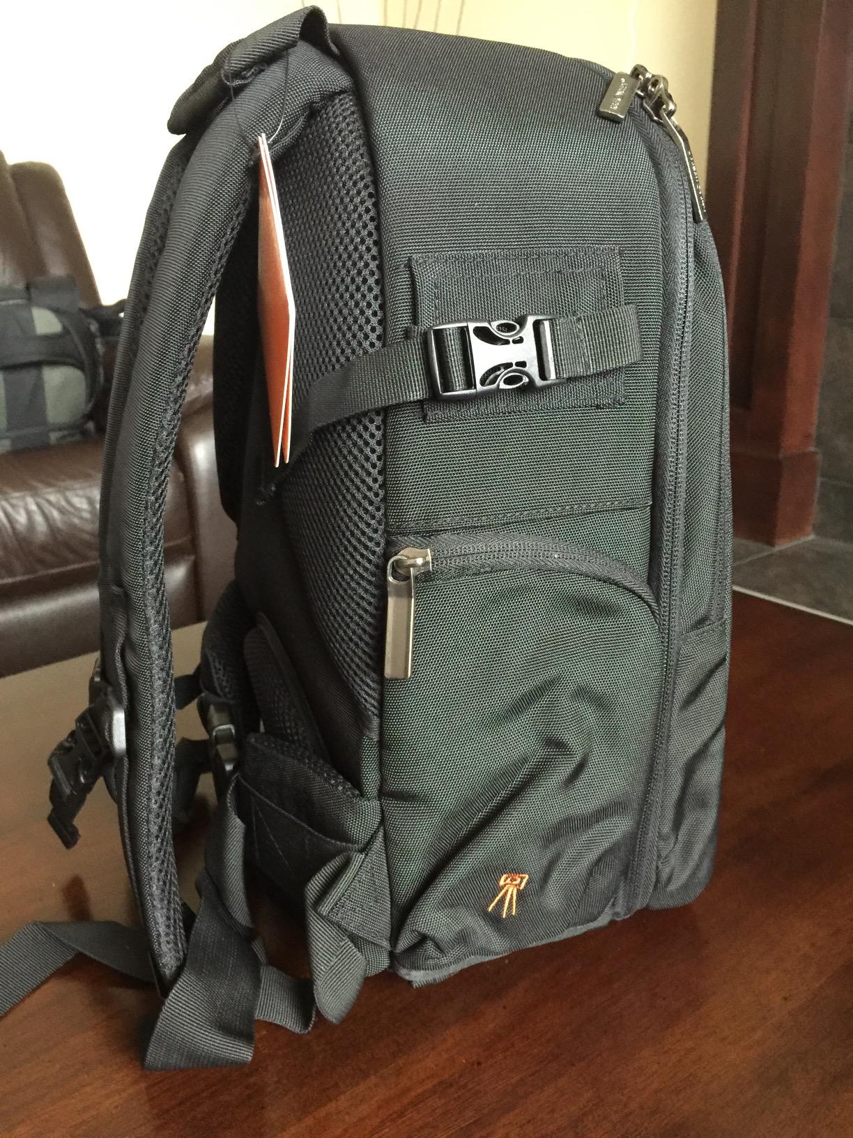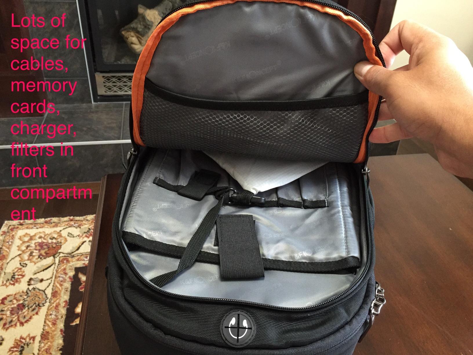 This is a very well made, compact backpack perfect for camera gear- and it even attaches a tripod to the side of it!The slim front pouch is a great spot for a cell phone and doesn't feel super easy to access- which provides a bit of safety from pick pockets. The center pocket neatly holds notepads, pens and more gear or supplies. The padded slots inside securely hold a DSLR camera, various lenses, cases, gadgets, and can be reconfigured to suit your needs. The backpack holds a nice shape and can easily fit into luggage or a larger backpack (which is exactly how I plan to configure my carry on luggage).The pack also features padded and rugged straps with both shoulder, waist and chest connections to assist you in carrying a heavier load of gear. The chest connector was slightly higher up on the pack and I think if I a person were taller than 6'2" the pack wouldn't fit quite as well. I very much like that the pack isn't huge and seems to fit the perfect amount of gear I would choose to travel with for any given trip. The overall finish and branding on the back pack looks classy and of high quality and it features hot orange trim and accents inside of the middle pouch. It even comes with a branded rain pouch to cover your gear in emergencies. A very well made, well thought out product!GREAT photography bag overall and exactly what I needed.I received this backpack along with the 62 inch tripod for testing and review purposes. All opinions expressed here are genuine and true to my impression of the items!