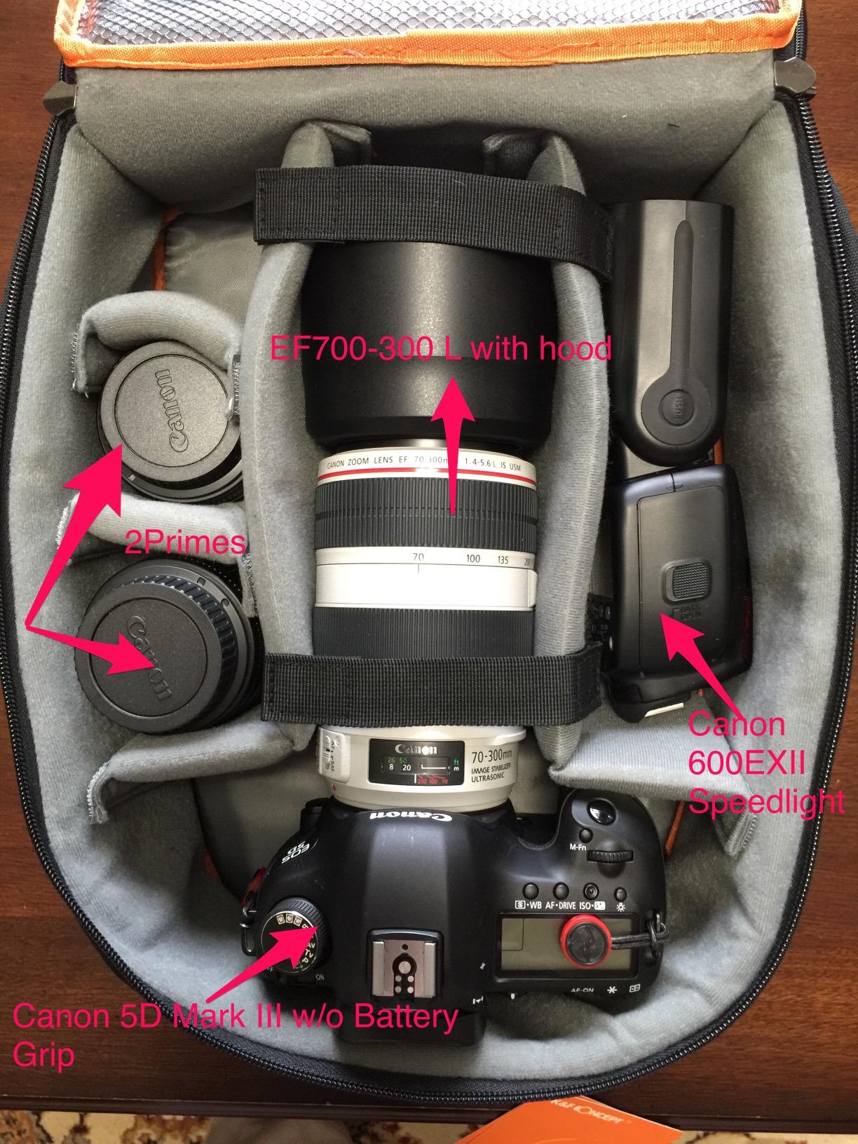 I have accumulated few camera bags in different sizes and styles in last few years mainly from LowPro and ThinkTankPhoto. I was looking for something compact to transport one camera and 1-2 lenses. I am glad to test and review this product. This bag is not only lightweight and compact, but you can actually fit lots of gear. Overall I am satisfied with this bag and definitely recommend it. Here is the summary of my review findings:* Good quality materials inside and out.* Nice padding inside the bag and inside dividers are fully customizable. One of the unique feature was there are some safety belt lines inside to avoid accidental dropping.* It easily fits my Canon EOS 5D Mark III along with long lens Canon EF 70-300 L lens with hood attached, 2 prime lenses and large speedlight 600EX. Another possible arrangement is Canon EF 24-105 L lens instead of 70-300. Please see attached photos. I tried to fit both 24-105 and 70-300 together which is too tight and bag bulges on the side. This is perfectly okay since this bag is not designed to handle that much amount of gear. It should be noted that 5D with battery grip will not fit easily due to height limitations of bag.* On front there are two compartments. The front compartment is small and middle compartment is fairly large. You can pretty much fit almost everything you would typically carry like extra batteries, charger, cables, memory cards, cleaning clothes etc.* Bag seems quite water resistant and also includes rain cover.* There is provision for tripod (tripod holder)on one side. Also both side there are pockets to keep water bottles, snack bars etc.* There is headphone slot as well.* High density EVE foam lined in the interior dividers to prevent from shocking and dropping.* Wide padded shoulder strap, adjustable slings, waist belt and safe buckle for easy carrying made is a great travel companion* Back of bag is well padded and ventilated for maximum comfort.* I wish it was little deeper so that camera with battery grip can easily fit. Other than that, it is perfect bag for my needs.Overall, good bag if you want to travel light. I received a sample product for unbiased testing and review.