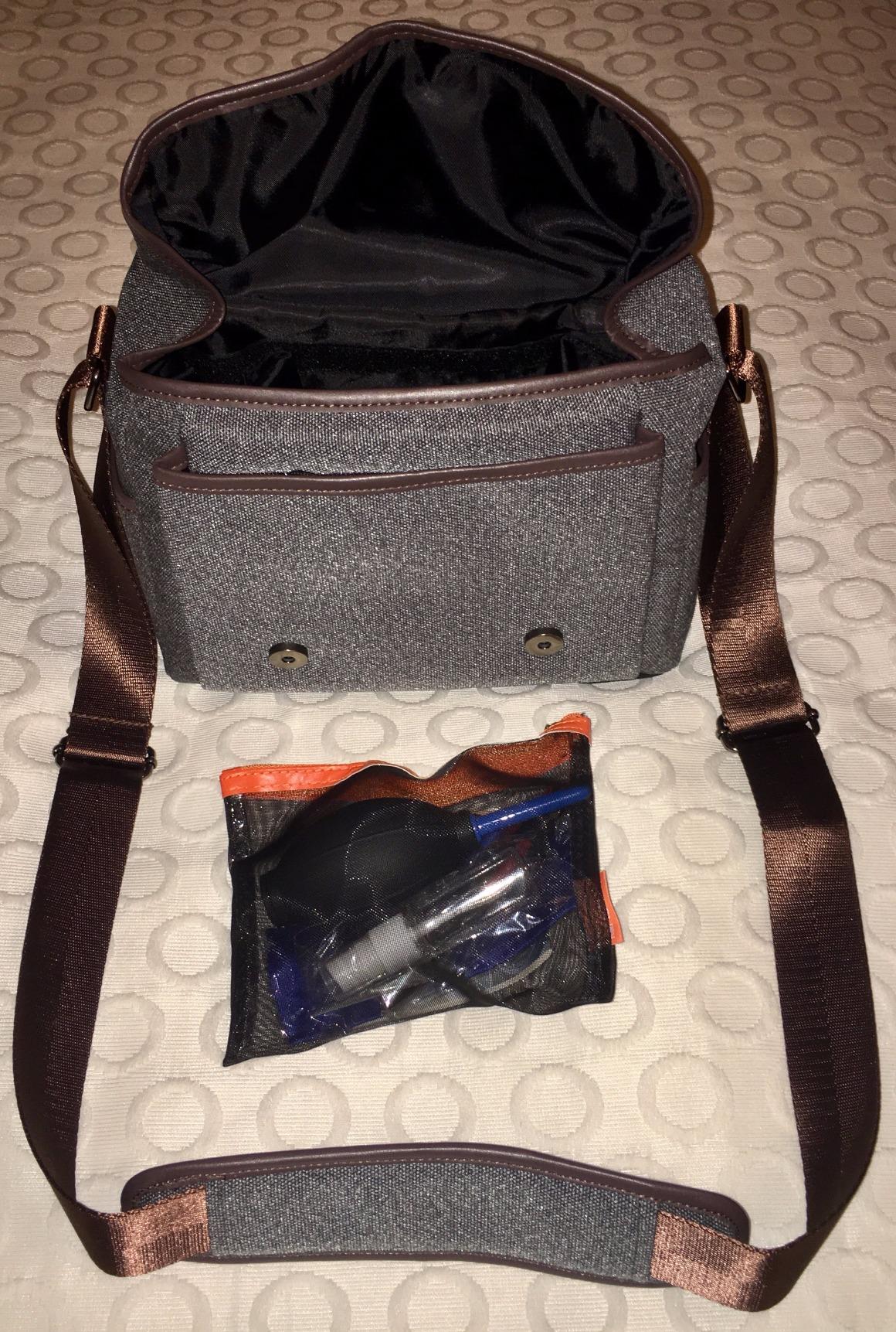 Very impressed with this camera bag. With me being a filmmaker/photographer I'm often out with 2 large backpacks, one with drone and the other with dslr and lenses....but after receiving this amazing bag I can now carry my camera, lenses, batteries, filters etc with ease and comfort.The design of this bag is perfect, built to a very high standard. I especially love the look of the buckles on the front which are intact magnetic pop buttons underneath for easy access...There is plenty little pockets to fit memory cards, your phone, cleaning wipes or some snacks in.The back comes with a lens/sensor cleaning kit which is awesome :)The strap feels tough and sturdy so nothing to worry about snapping...the shoulder pad is comfyIt looks like a fashion accessory not a camera bag which is extremely handy if your worried about theft of your bag...