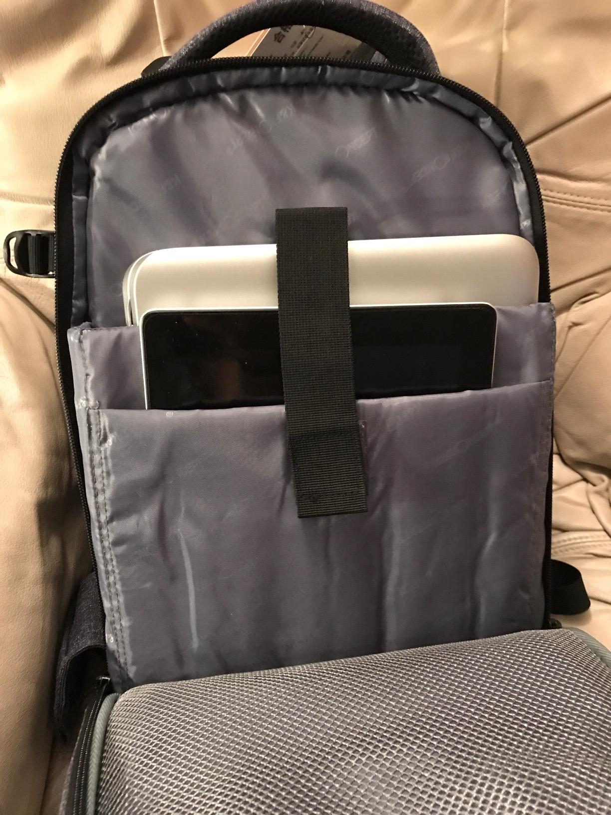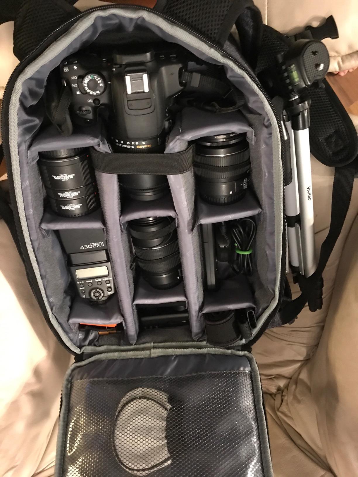This is a lightweight camera backpack bag. It looks nice.I usually carry my EOS 80D + few lenses, plus my EOS M5 and some EF-M lenses. In the photo, I have stowed 80D camera, EOS M5 camera, and EF-S lenses - 18-135mm, Sigma 8-16mm (a fairly large lens), 55-250mm STM, 50m, 40mm, 24mm, and EF-M lenses 15-45mm, 28mm macro, 11-22mm. The camera gear is accessible from the side closer to the body. Which means it makes it safer against risk of someone opening backpack and stealing my stuff. Sufficient dividers are provided and these are configurable.For laptop, my 13" Asus fits easily. There is a separate section for tablet as well.In addition to laptop and camera compartment, there is a separate compartment in front for documents. There is also tripod section which I do not use so I am unable to comment on.The bag itself is well padded and fairly lightweight. All in all it is a well designed bag and I recommend it to other friends.