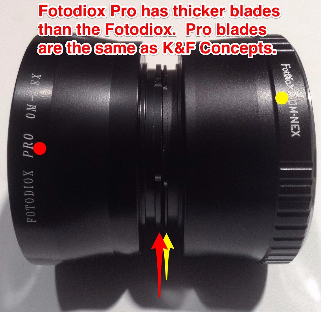 Again, the blades that engage the adapter to the Sony camera body are the same thickness for the Fotodiox Pro and the K&F Concepts, but are much thinner (for some reason) with the Fotodiox adapter. Oddly, they all feel the same when attaching lenses or when attaching to the camera body.