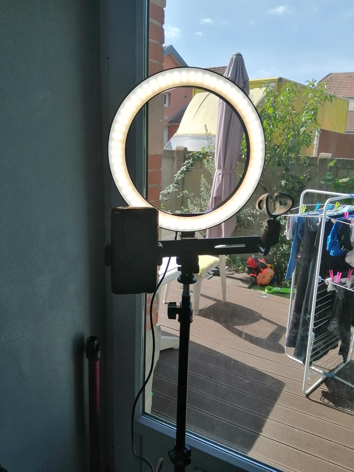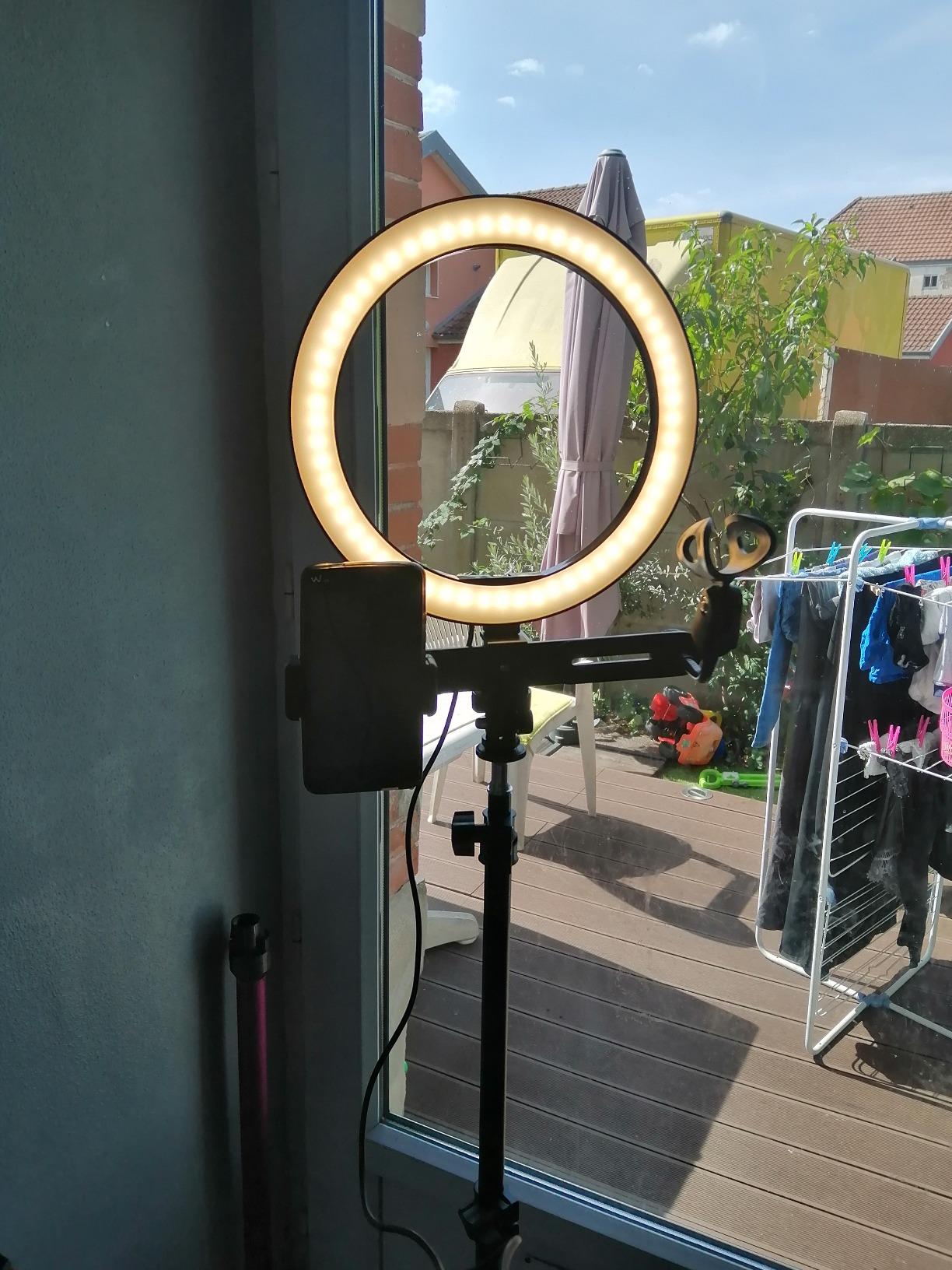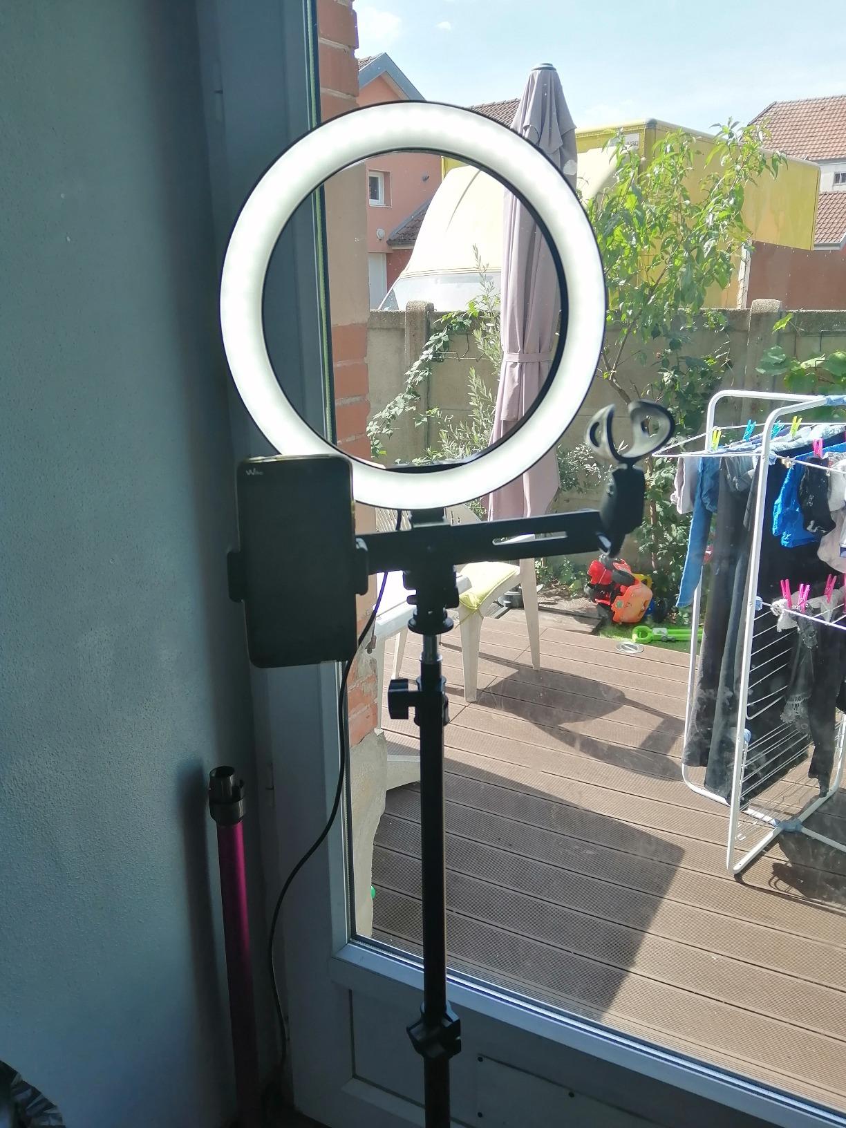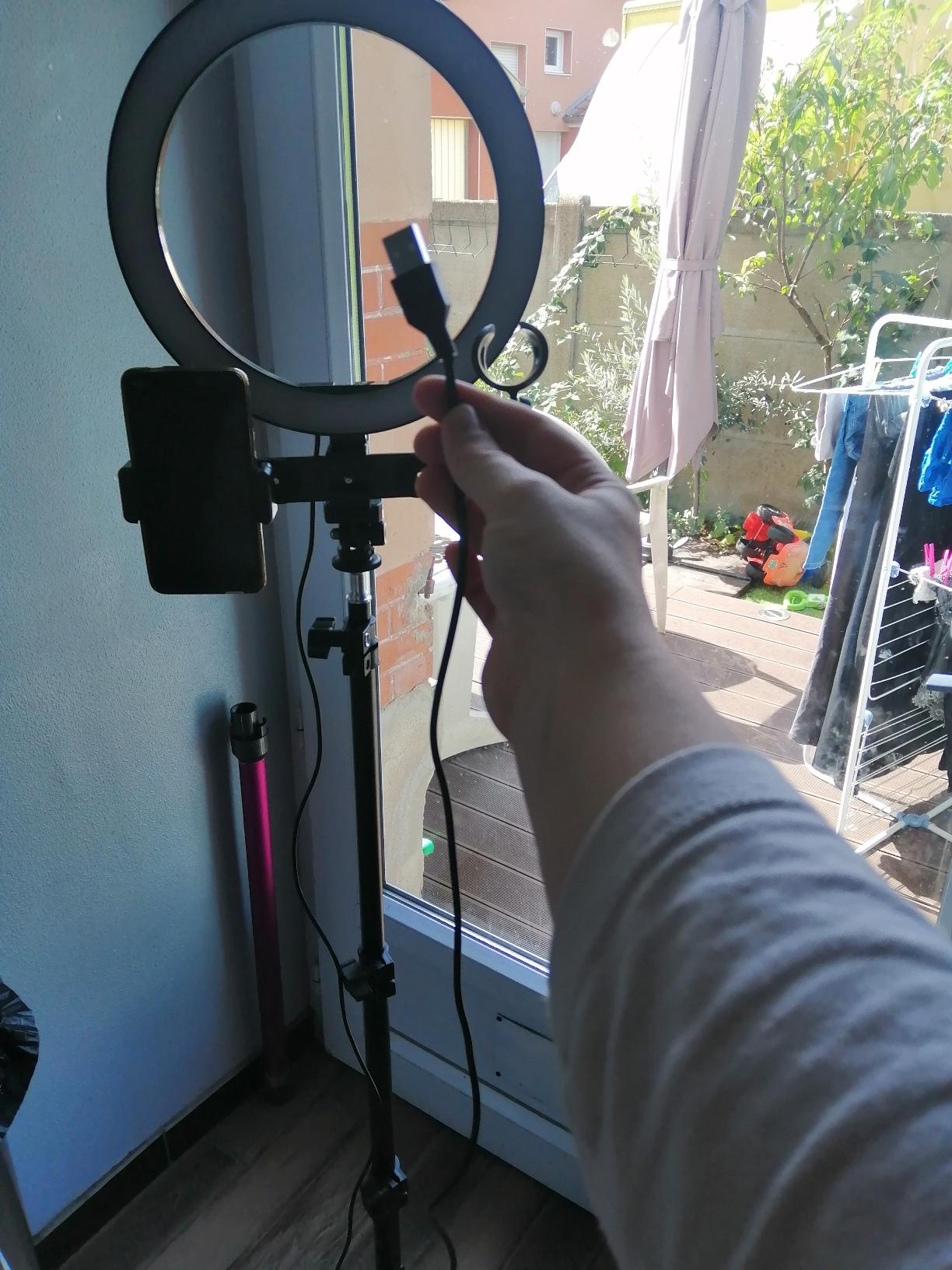 am delighted with this selfie ring. It has several lighting modes, warm light, cold light and daylight, I loved the fact that you can adjust the intensity. You can also put the tripod at different heights and I think that is a plus, because you can put it on the ground or on a table and that is great for face cam on your tutorial videos, because you can also tilt the circle too, for example for cooking tutorials. There are two phone mounts, good in case one breaks, my phone serves as a screen return for my camera. The only thing missing is the USB charger socket, I took the one from my old phone, but the advantage of this USB socket is that if you have no more juice at home because of a power outage, plug your selfie ring into a portable battery and you will have light. There is also a place to hold your microphone, but after that it does not hold large microphones, just perfect for a small low-end microphone or a karaoke microphone. I really recommend it