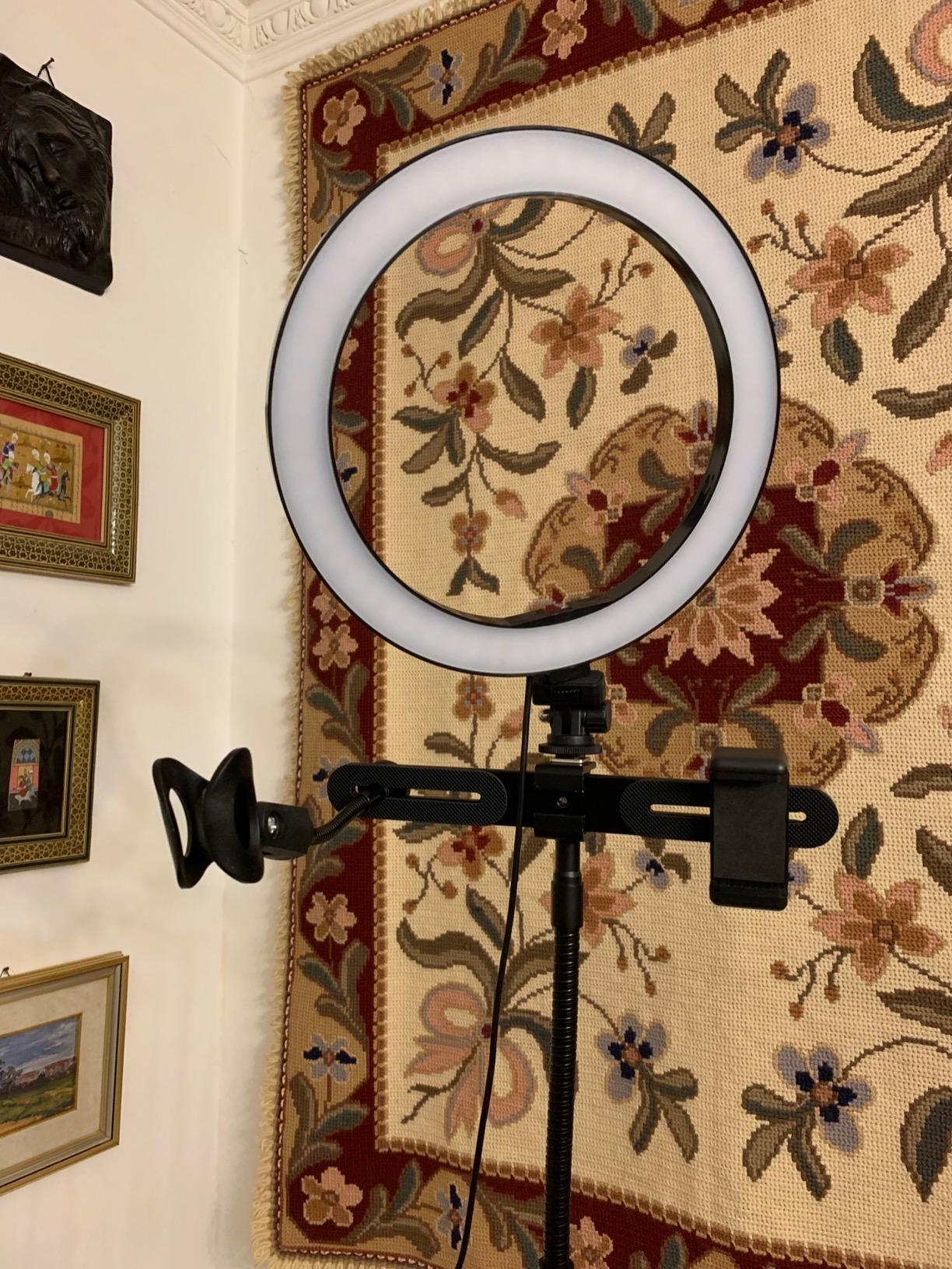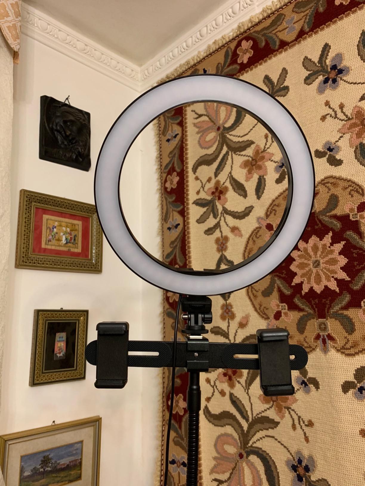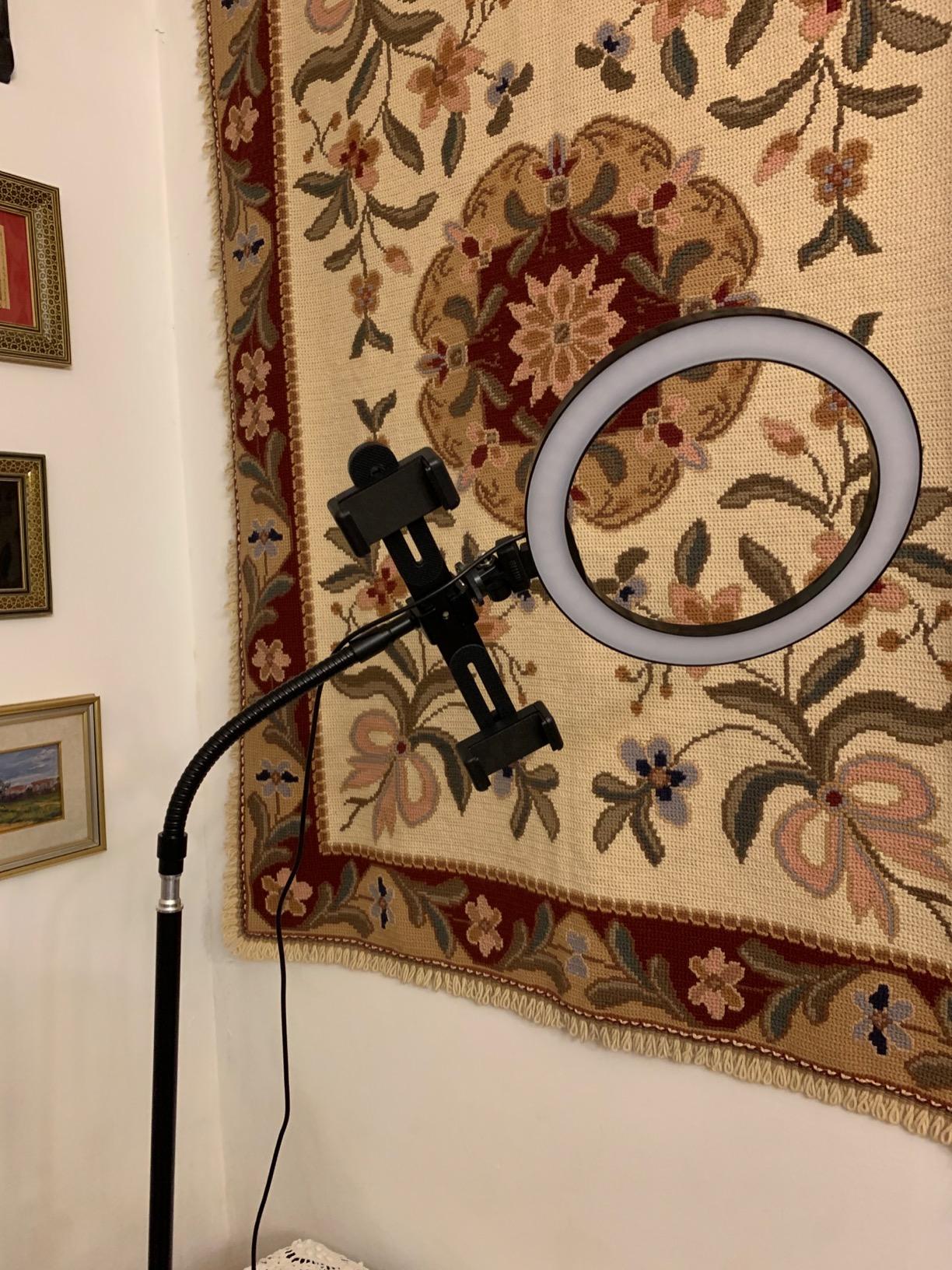 real set of accessories for photos and videos to be envied. I have been using it a lot since I received it because I can finally shoot videos for the web using as few accessories and supports as possible. The package includes: the actual ring light, with a diameter of 10 inches, the 1.4m long support, a bracket, a flexible tube and the support clips for the phone and microphone. The light is adjustable in both intensity and heat (cold white light and warm white) and the flexible tube makes positioning and adjusting the light very simple even for beginners. I also find the smartphone support extremely convenient as it allows me not to use additional supports, and the fact that the light is powered by a USB socket, a detail that makes it very versatile.
